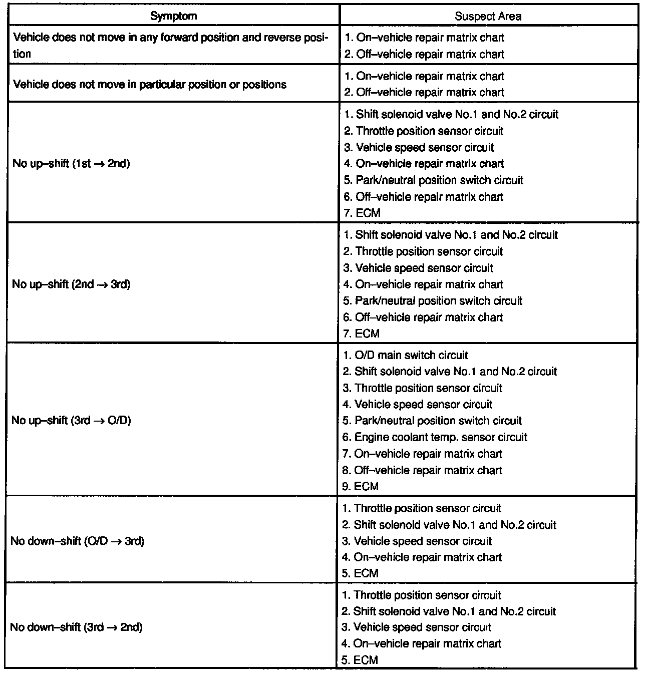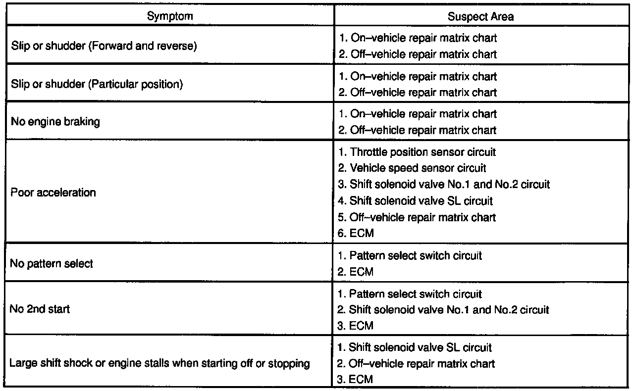 If a normal code is displayed during the diagnostic trouble code check but the trouble still occurs, check the circuits for each symptom in the order given in the following charts.The Matrix Chart is divided into 3 chapters. Chapter