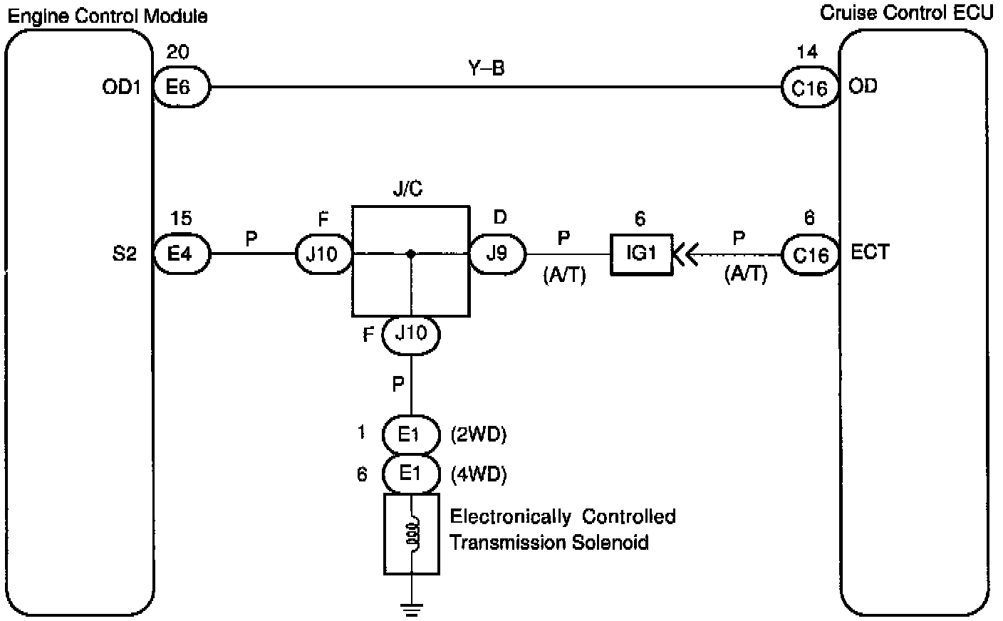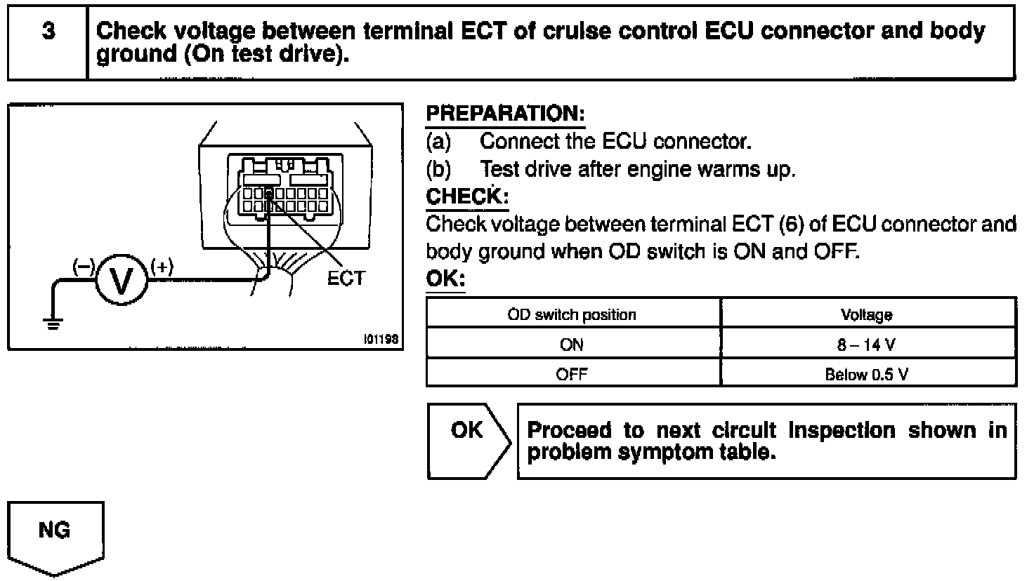 Terminal ECT of the cruise control ECU detects the shift change signal (output to electronically controlled transmission No. 2 solenoid) from the ECM.