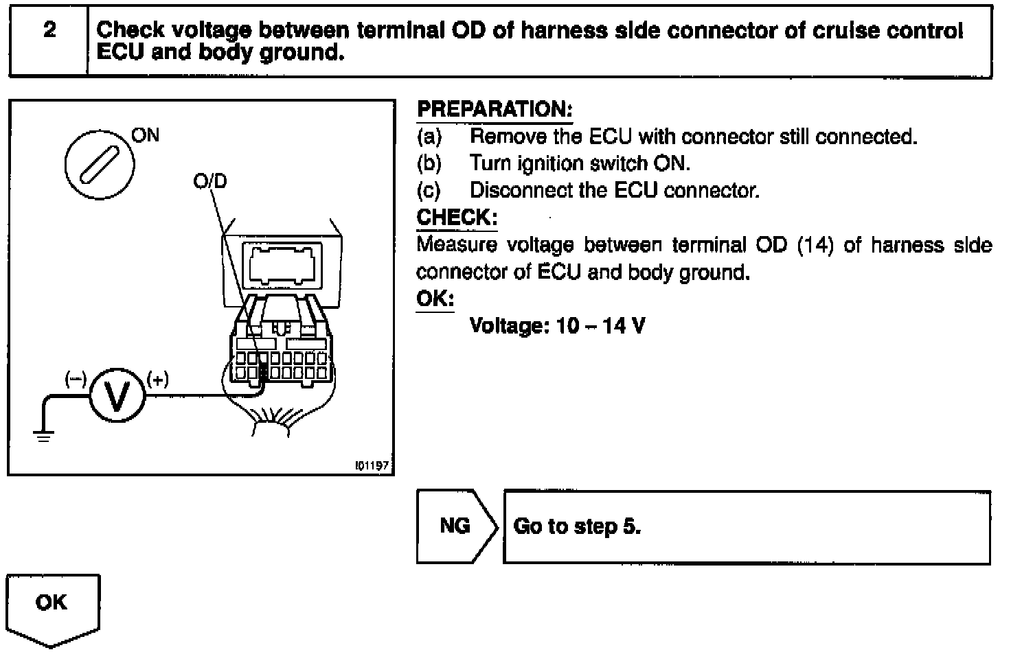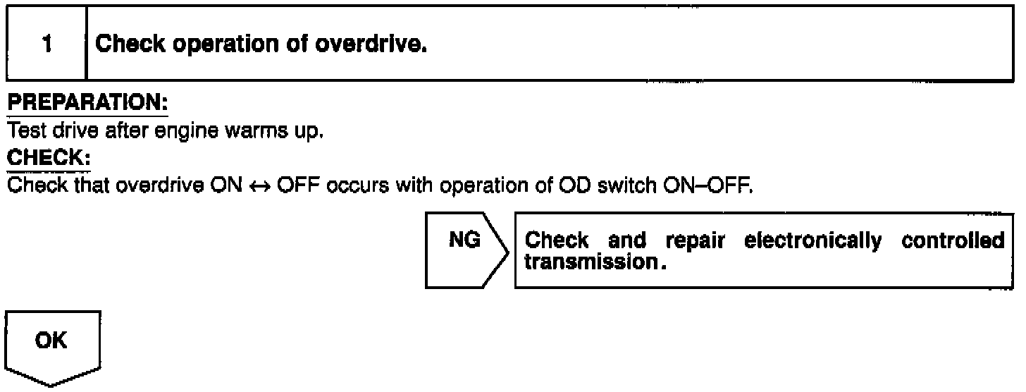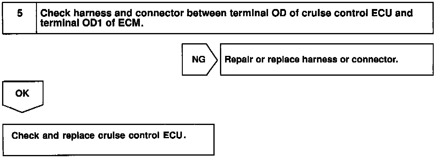 If vehicle speeds down, also when terminal ECT of the cruise control ECU receives down shifting signal, it sends a signal from terminal OD to ECM to cut overdrive until the end of the uphill slope, and the gear shifts are reduced and gear shift points in the electronically controlled transmission are changed.