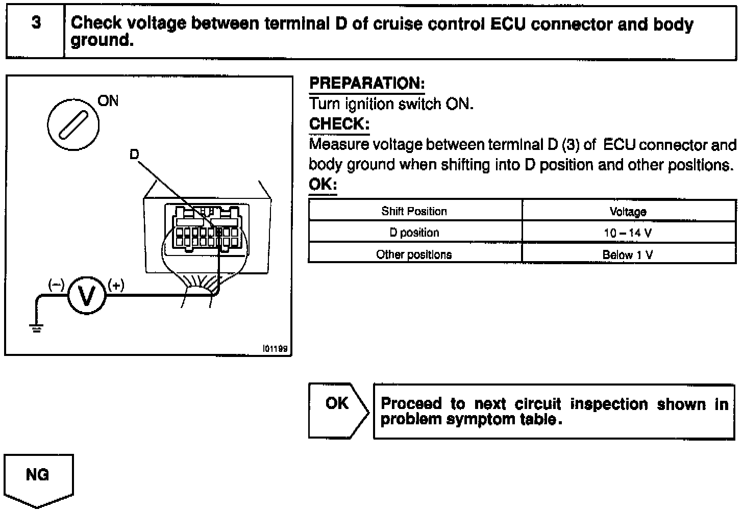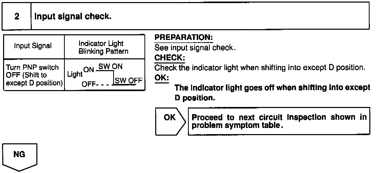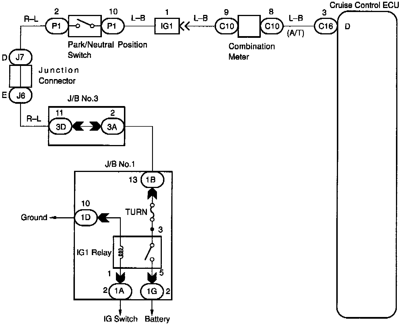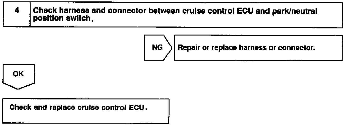 When the shift position is put in except D position, a signal is sent from the park/neutral position switch to the ECU. When this signal is input during cruise control driving, the ECU cancels the cruise control.