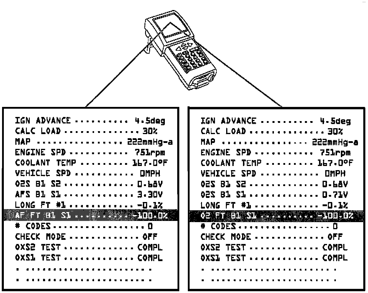 Due to an internal ECU data transmission error, the Toyota Diagnostic Tester will always display -100% for the AF FT B1 S1 and the 02 FT B1 S1 when viewing the data list on 1998 RAV4 with California Emissions. Please use the SHORT FT # 1 data instead.