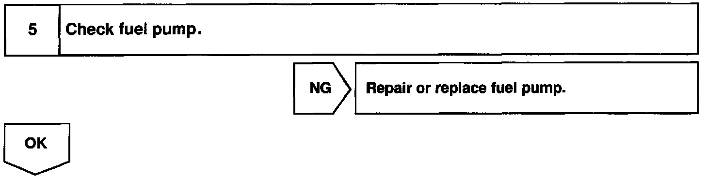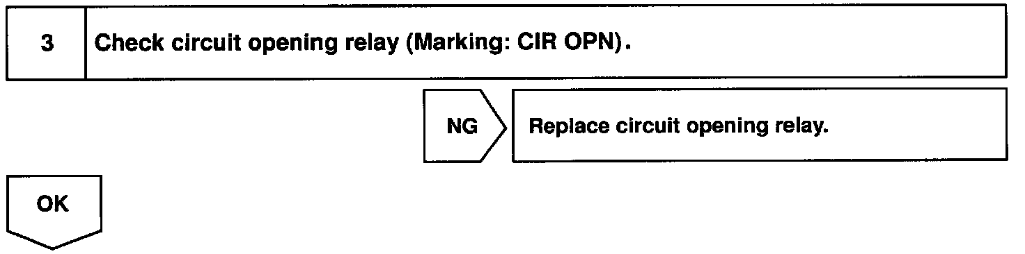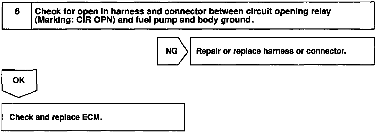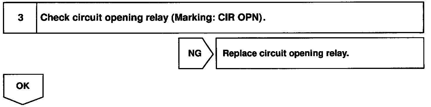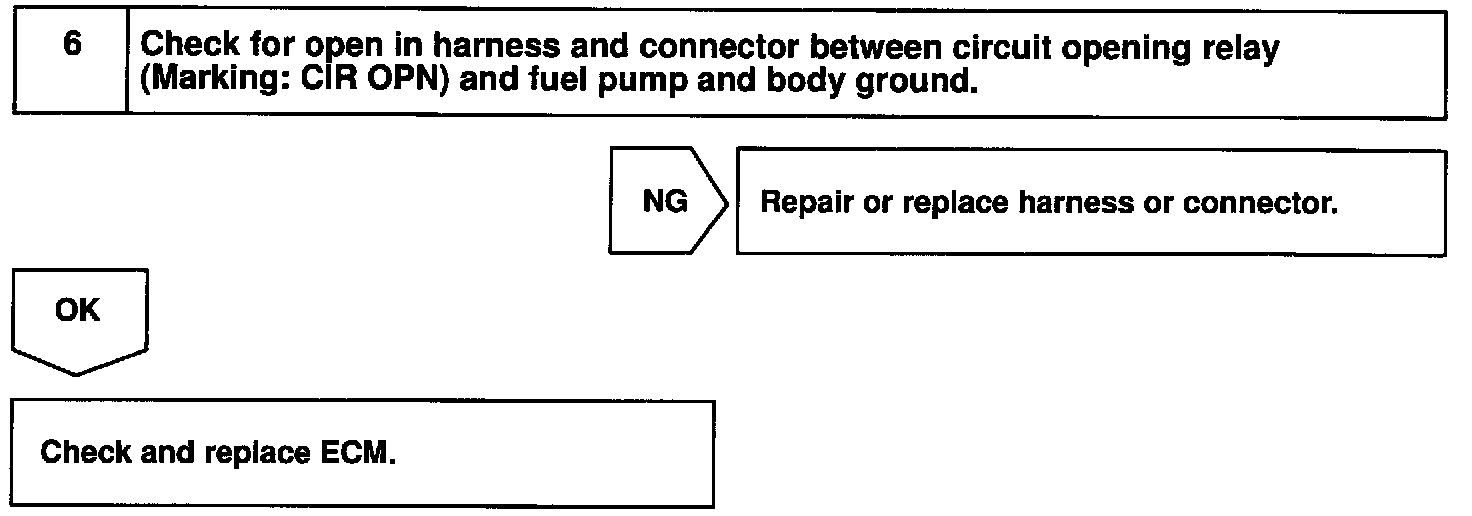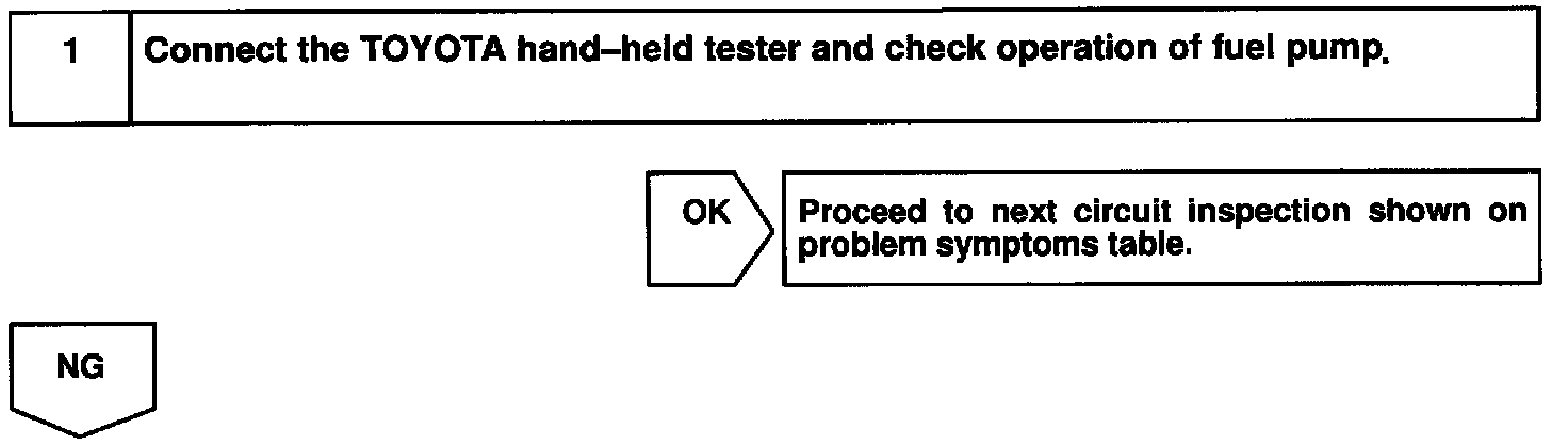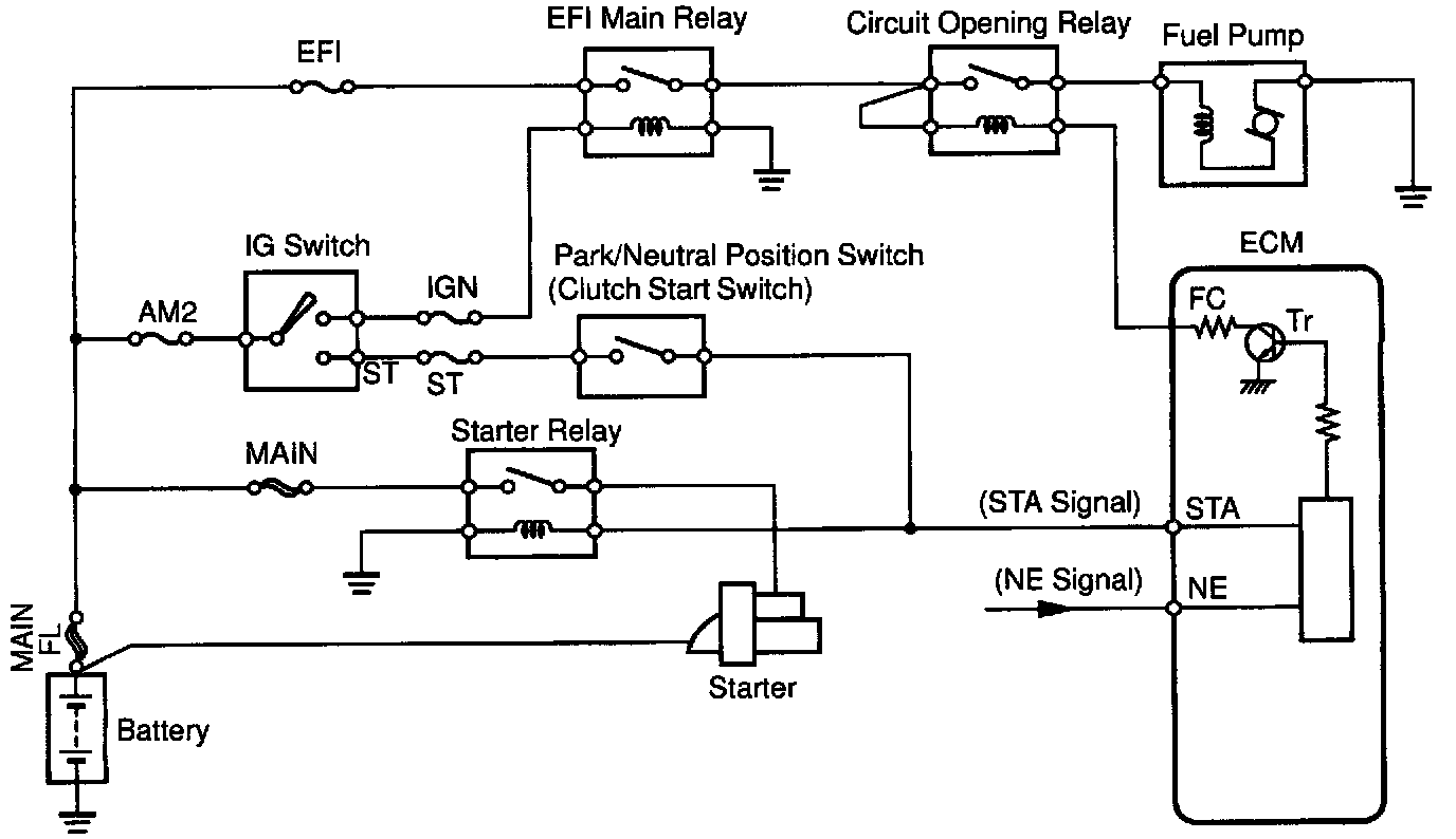 When the STA signal and NE signal are input to the ECM, Tr is turned ON, current flows to coil of the circuit opening relay, the relay switches on, power is supplied to the fuel pump and the fuel pump operates. While the NE signal is generated (engine running), the ECM keeps Tr ON (circuit opening relay ON) and the fuel pump also keeps operating.