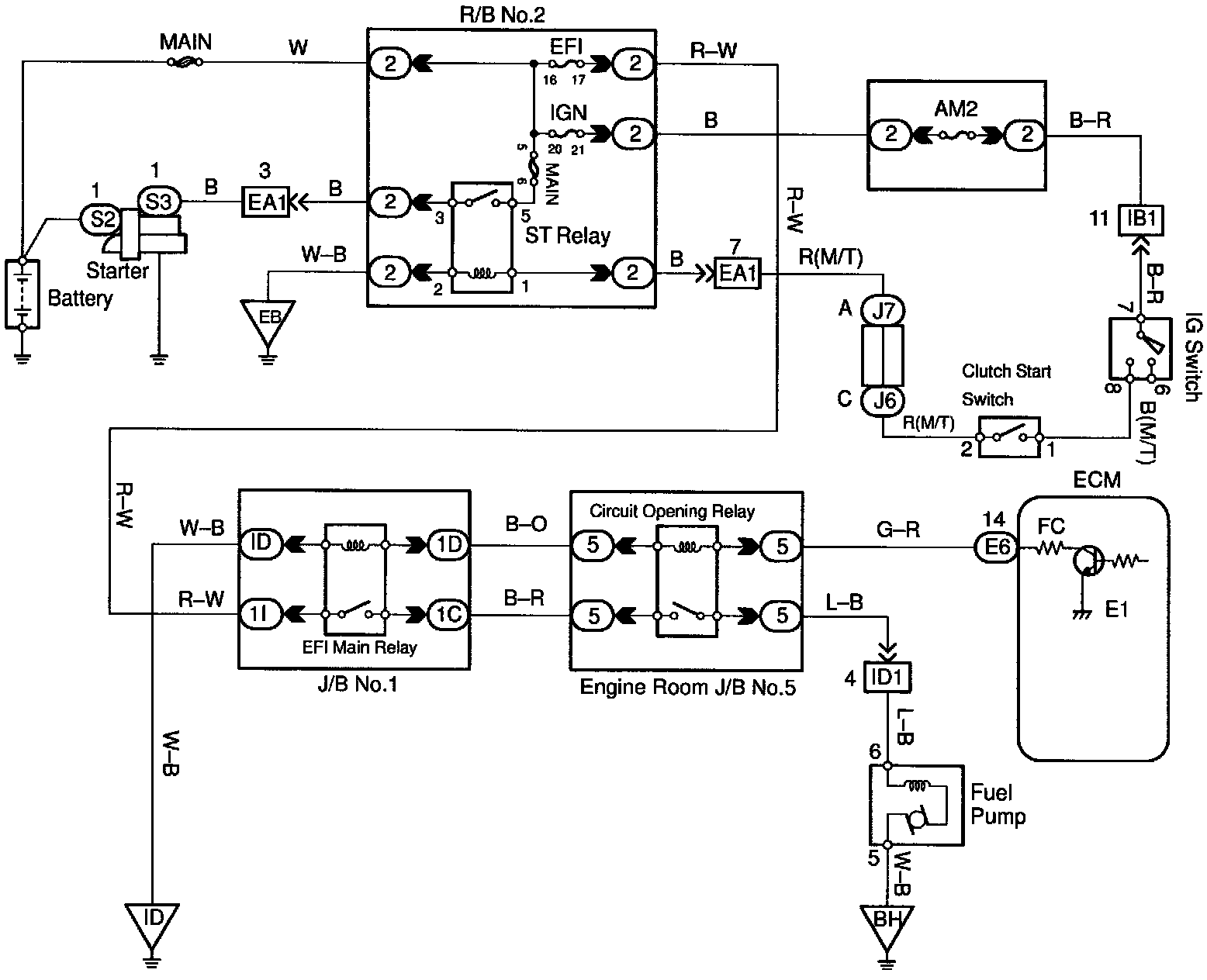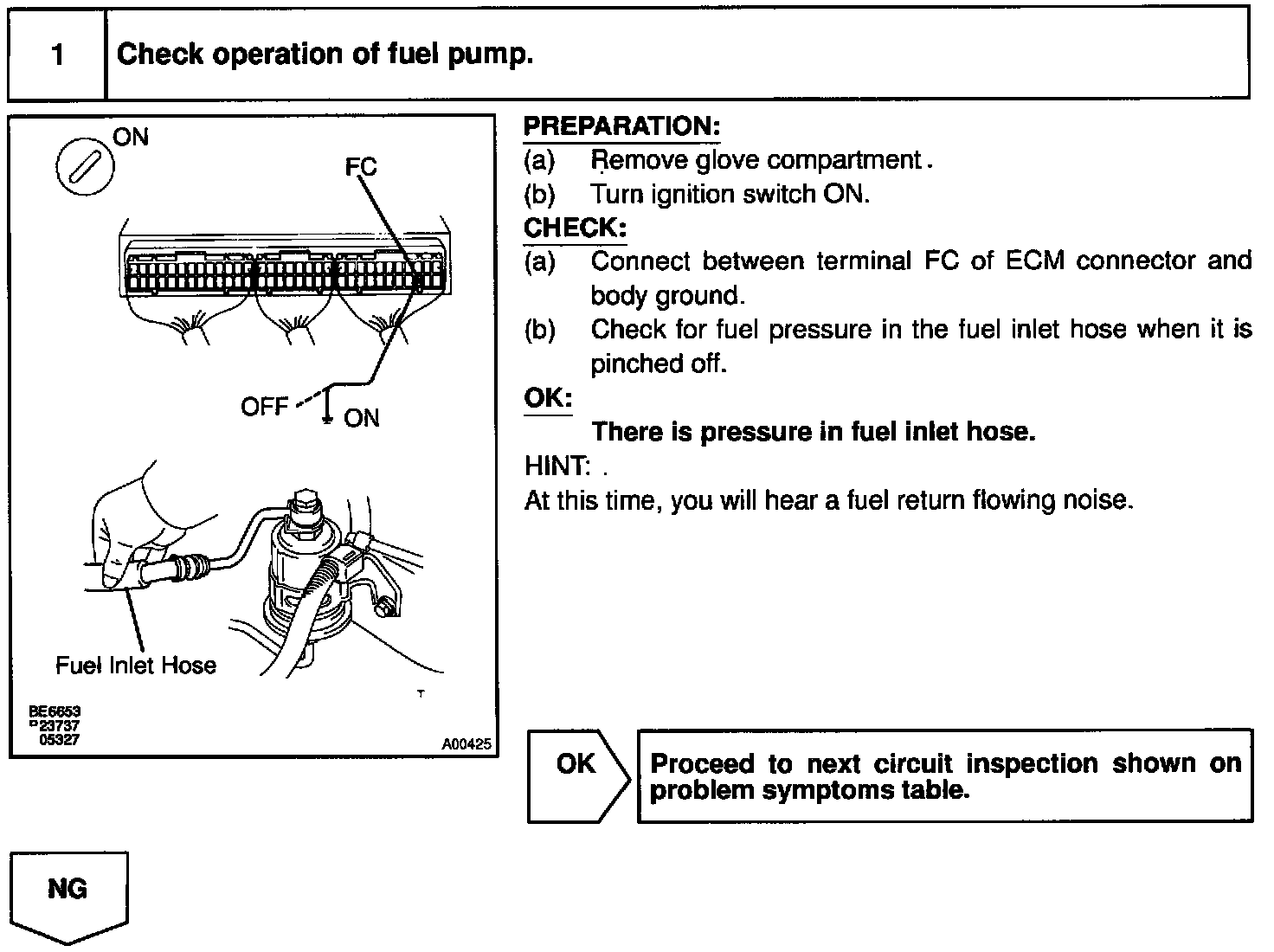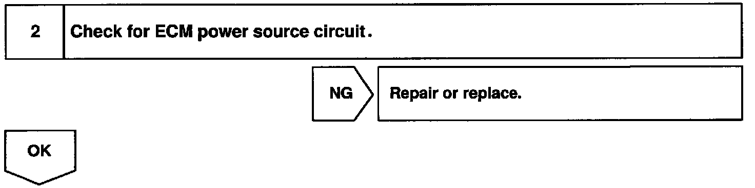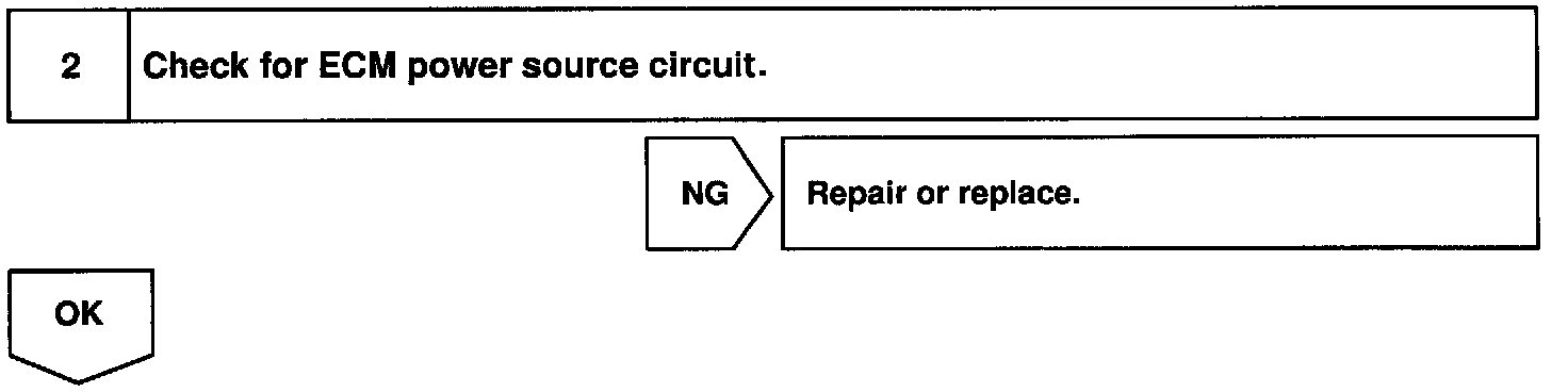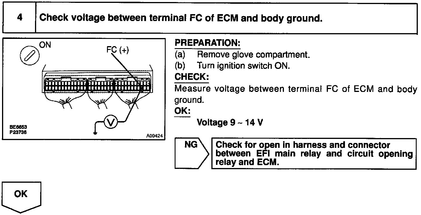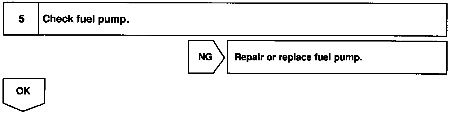 When the STA signal and NE signal are input to the ECM, Tr is turned ON, current flows to coil of the circuit opening relay, the relay switches on, power is supplied to the fuel pump and the fuel pump operates. While the NE signal is generated (engine running), the ECM keeps Tr ON (circuit opening relay ON) and the fuel pump also keeps operating.