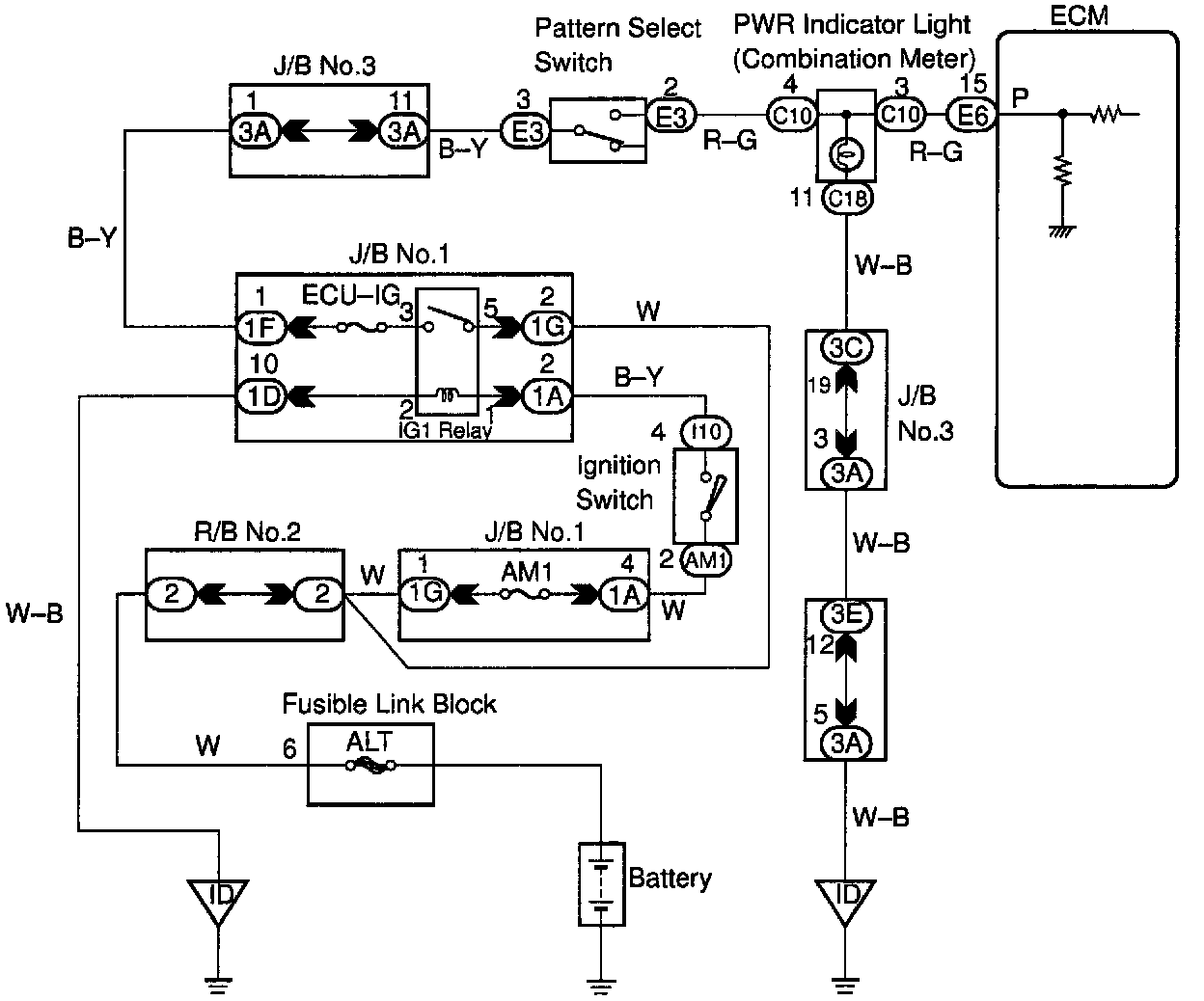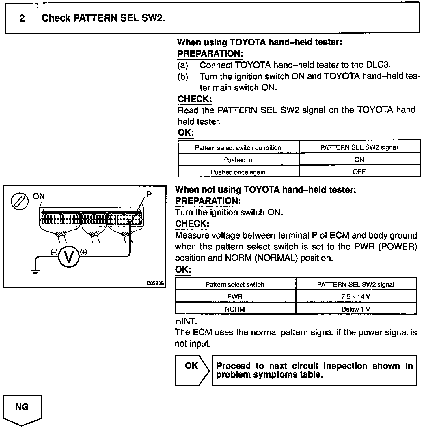 The ECM memory contains the shift programs for the NORMAL and P0WER patterns, 2 position, L position and the lock-up patterns. Following the programs corresponding to the signals from the pattern select switch, the park/neutral position switch and other various sensors, the ECM switches the solenoid valves ON and OFF, and controls the transmission gear change and the lock-up clutch operation.