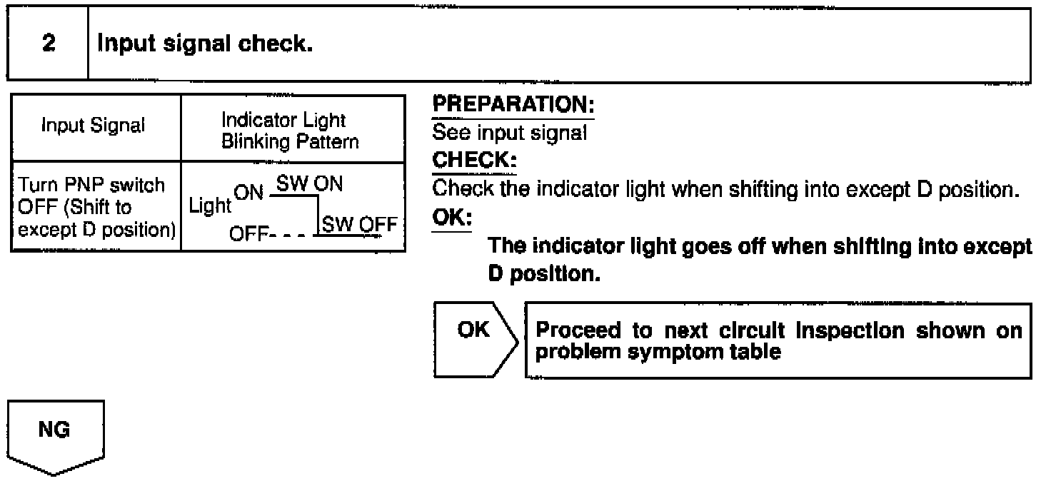 When the shift position is put in except D position, a signal is sent from the park/neutral position switch to the ECU. When this signal is input during cruise control driving, the ECU cancels the cruise control.