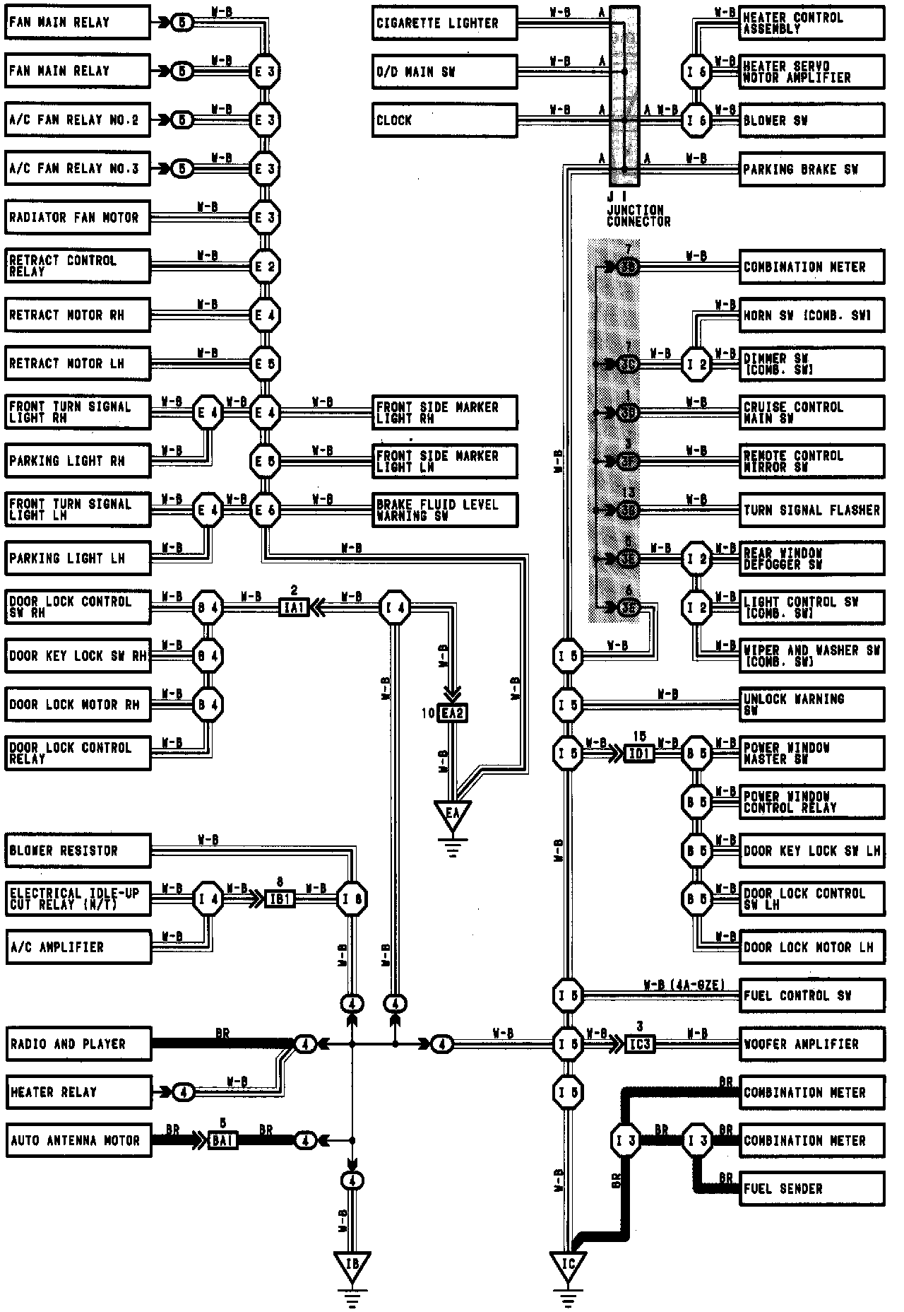 The ground points circuit diagram shows the connections from all major parts to the respective ground points. When troubleshooting a faulty ground point, checking the system circuits which use a common ground may help you identify the problem ground quickly. The relationship between ground points (EA, IB and IC shown below) can also be checked this way.