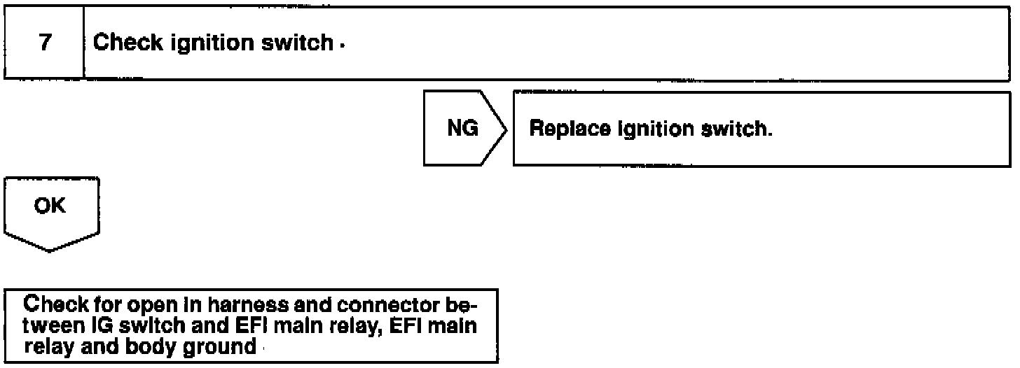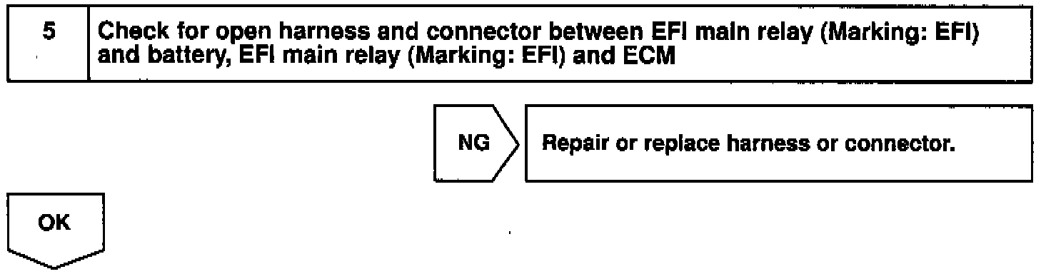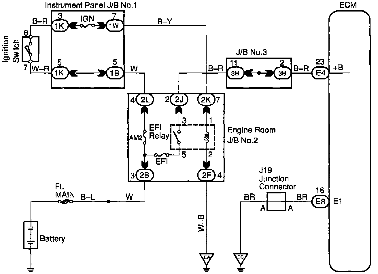 When the ignition switch is turned ON, battery positive voltage is applied to the coil, closing the contacts of the EFI main relay (Marking: EFI) and supplying power to terminal +B of the ECM.