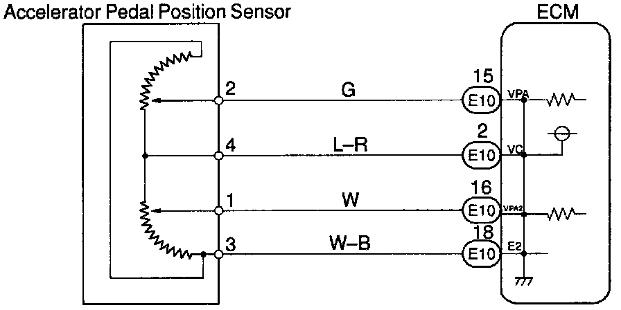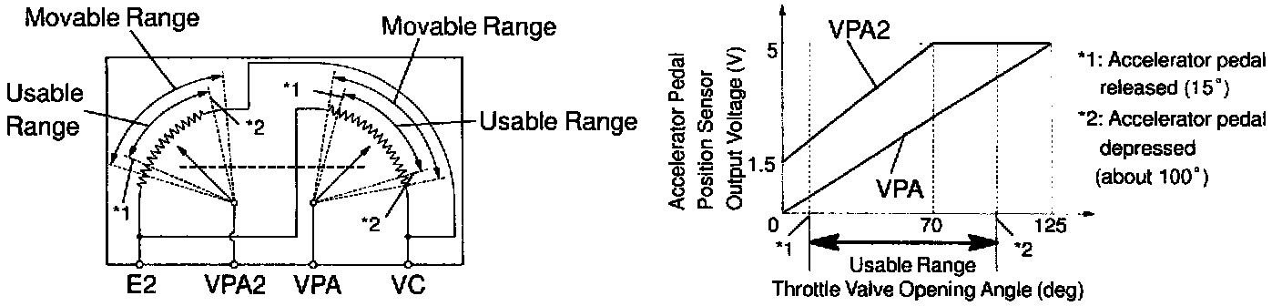 The accelerator pedal position sensor is connected with the accelerator pedal by the accelerator wire and the voltage applied to the terminals VPA and VPA2 of the ECM changes between 0 V and 5 V in proportion to the opening angle of the accelerator pedal.