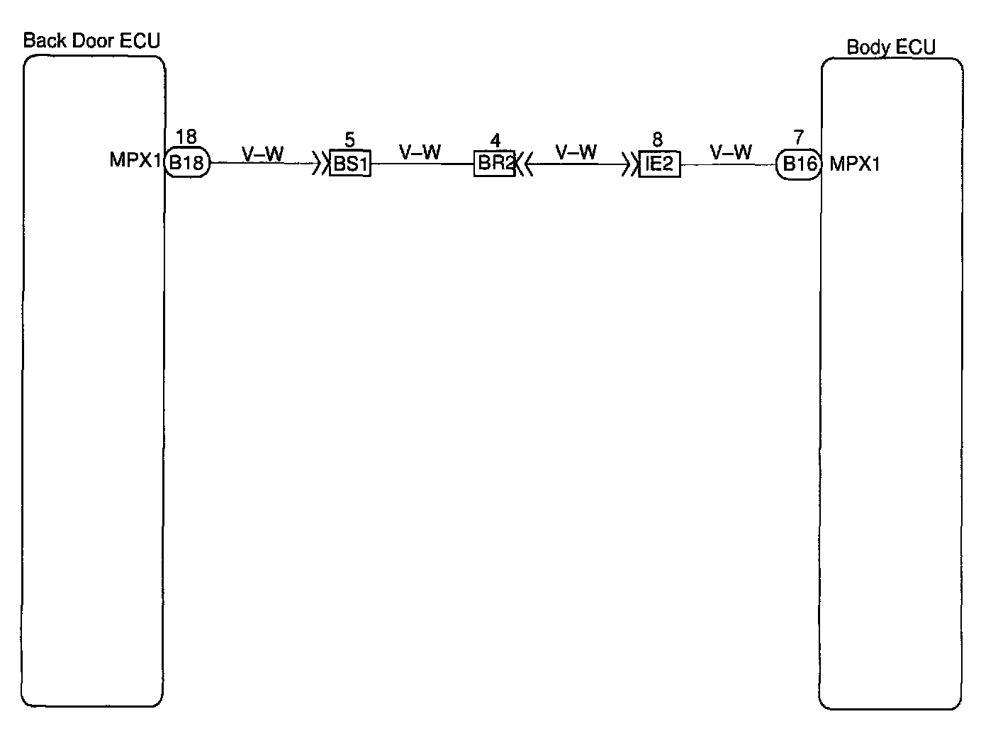 CIRCUIT DESCRIPTIONThis circuit communicates information of the wireless door lock control system, rear defogger system, open door warning, luggage light, theft deterrent system, rear wiper washer system and back door power window system between the Body ECU and Back door ECU.