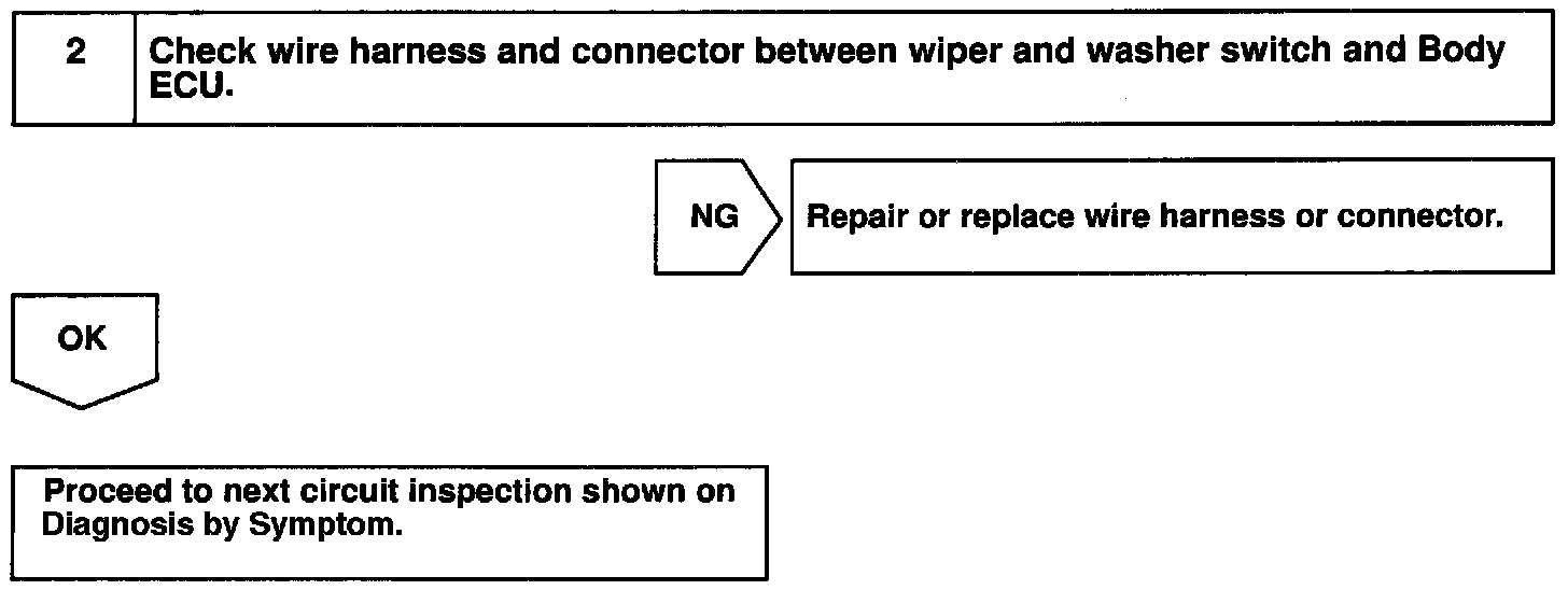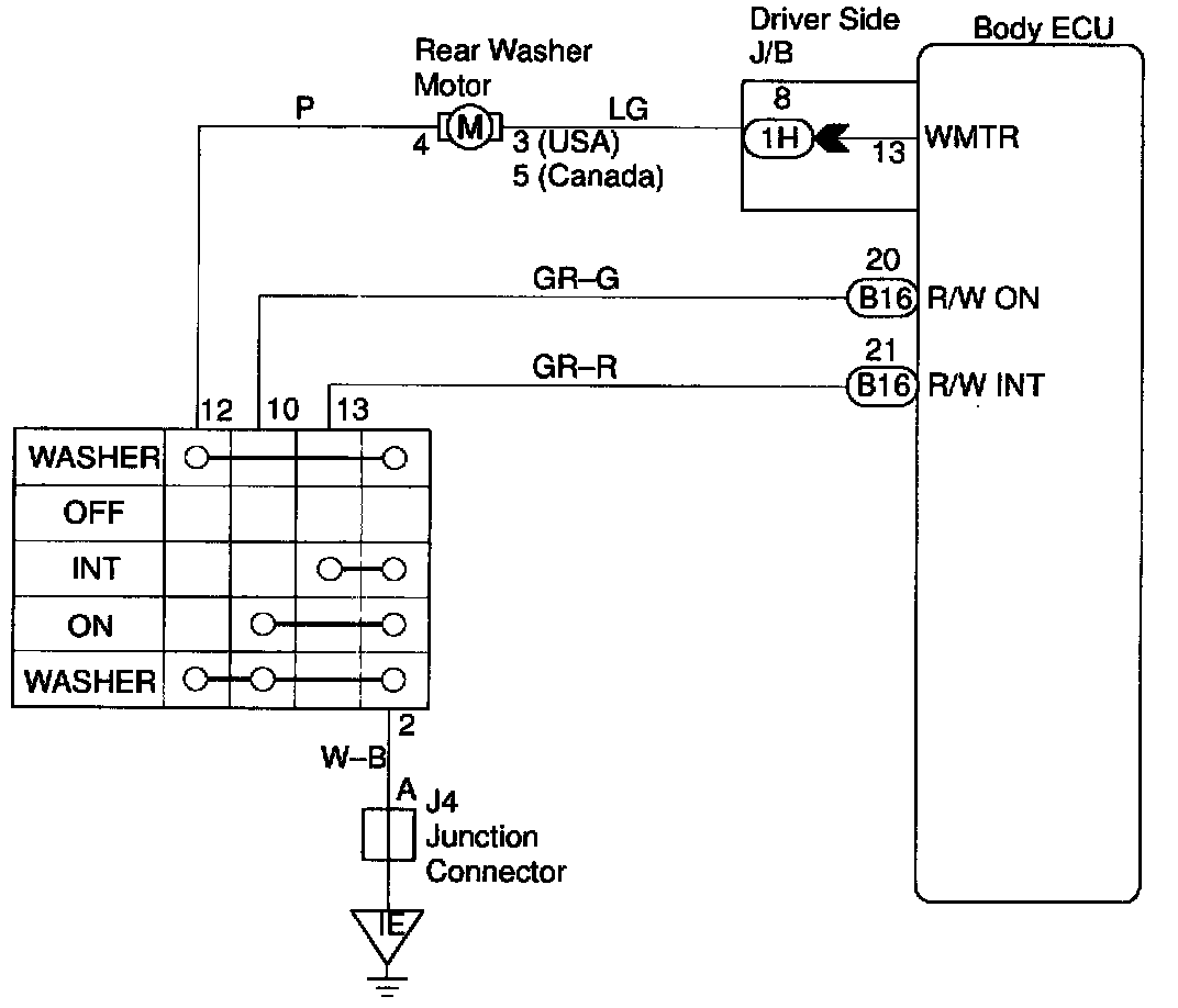 Body ECU judges the switch position with the terminal voltage of the rear wiper switch and runs the wiper motor.