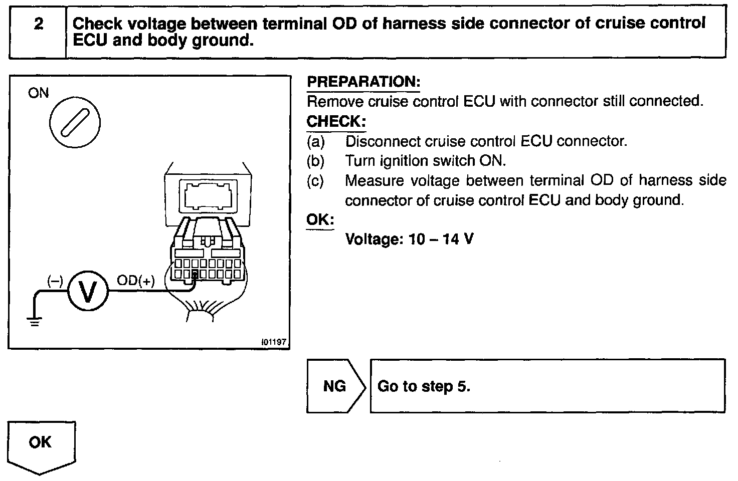 Terminal ECM of the cruise control ECU detects the shift change signal (output to electronically controlled transmission No.2 solenoid) from the electronically controlled transmission.