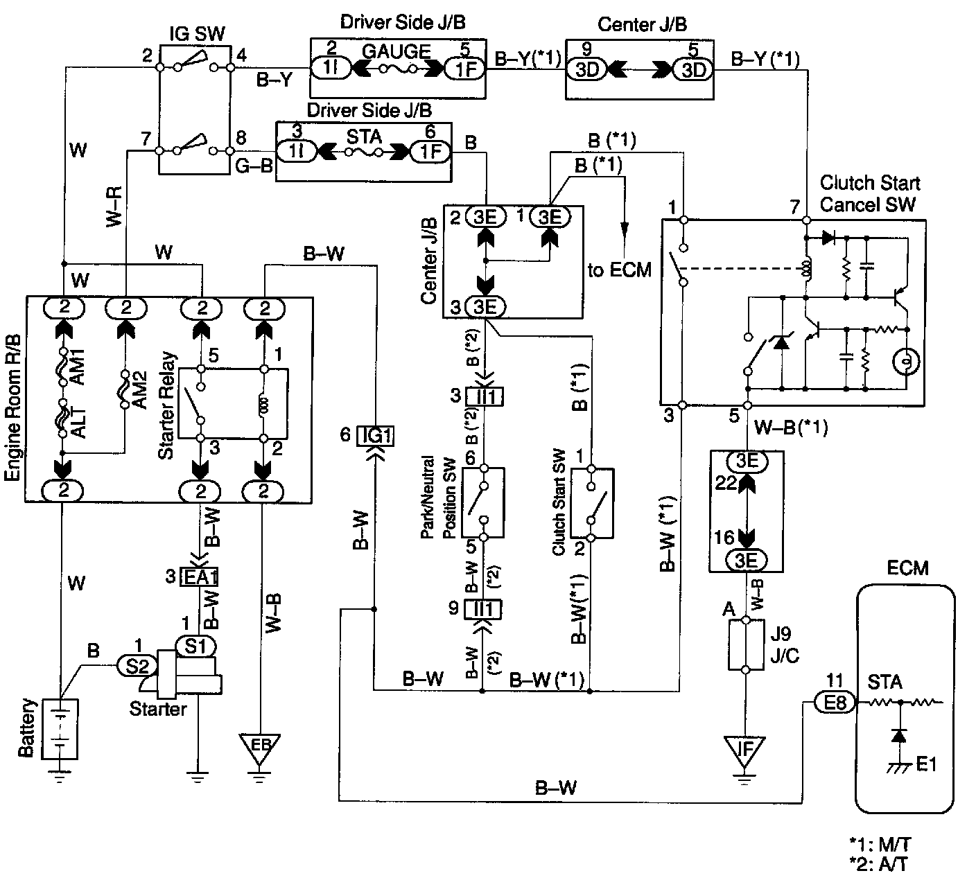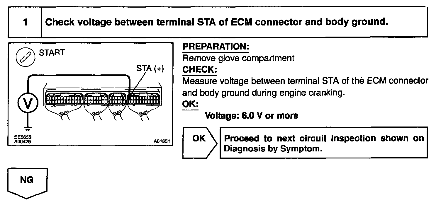 CIRCUIT DESCRIPTIONWhen the engine is cranked, the intake air flow is slow, so fuel vaporization is poor. A rich mixture is therefore necessary in order to achieve good startability. While the engine is being cranked, the battery positive voltage is applied to terminal STA of the ECM. The starter signal is mainly used to increase the fuel injection volume for the starting injection control and after-start injection control.