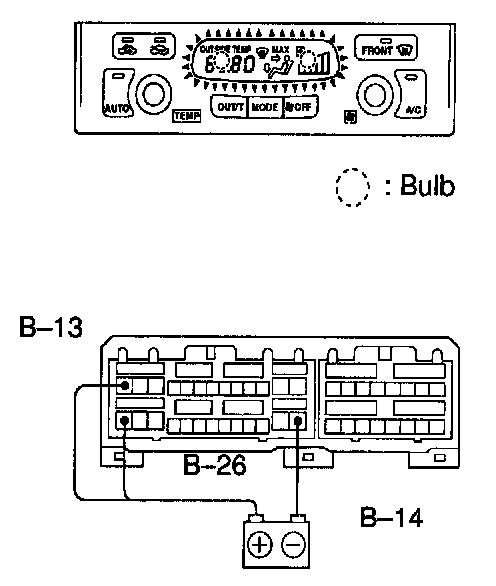 Connect the positive (+) lead from the battery to terminal B-13, B-26 and the negative (-) lead to terminal B-14, then check that the illumination lights up.