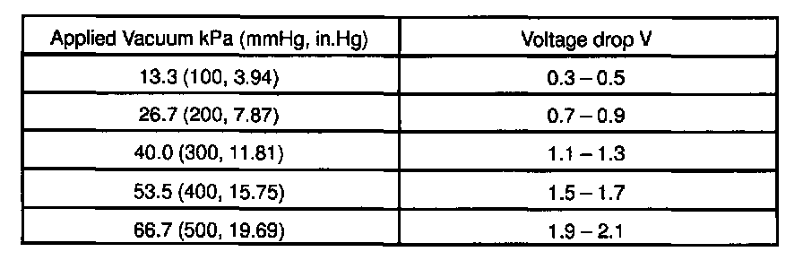 e. Apply vacuum to the MAP sensor in 13.3 kPa (100 mm Hg, 3.94 in.Hg) segments to 66.7kPa (500 mmHg, 19.69 in.Hg).