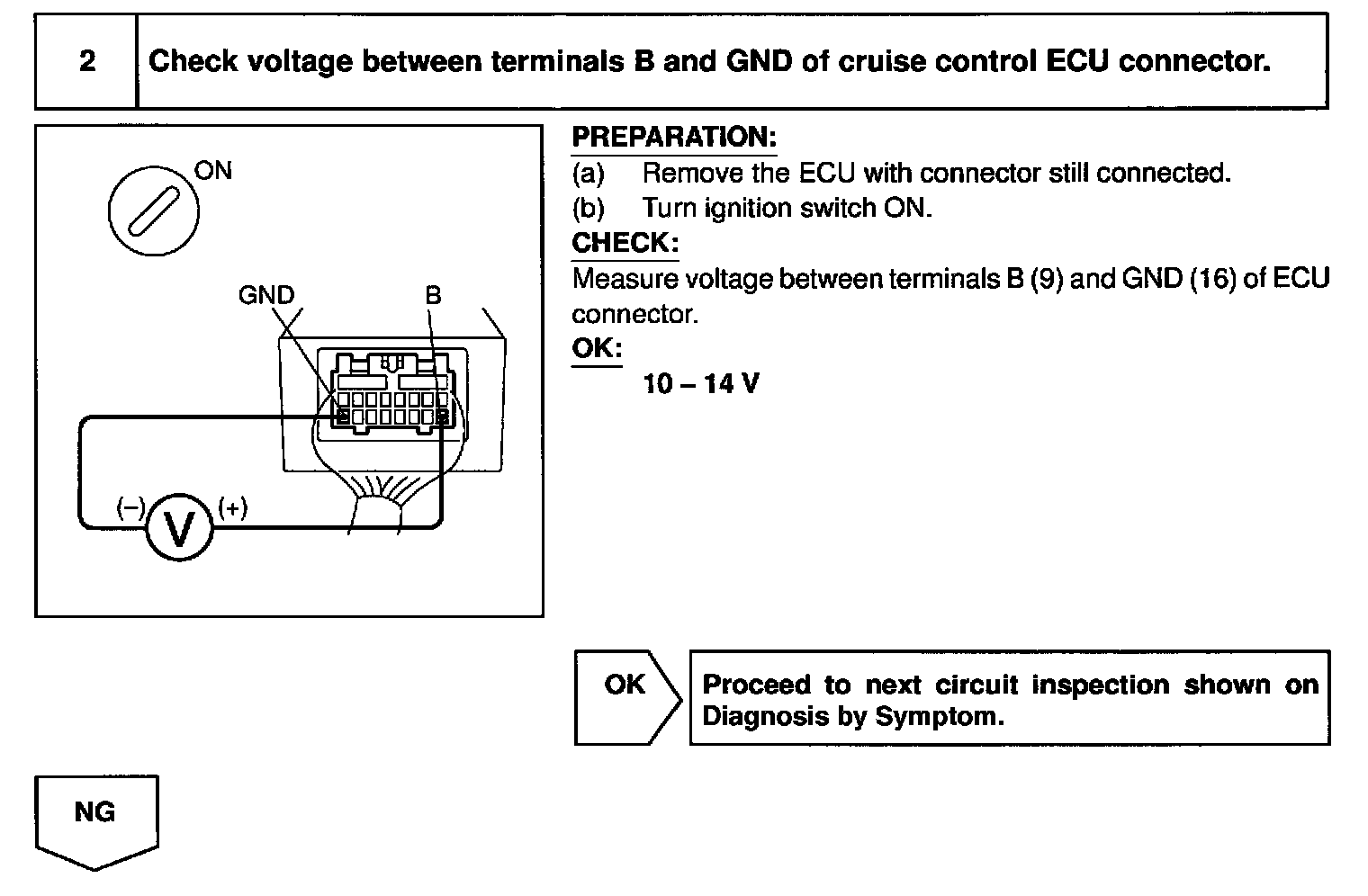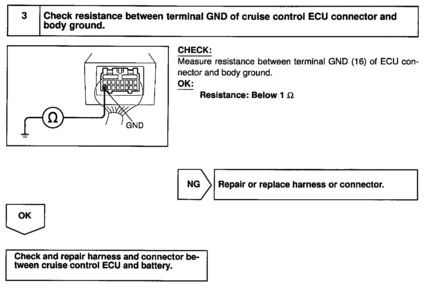 The ECU power source supplies power to the actuator and sensors, etc.. When terminal GND and the cruise control ECU case are grounded.