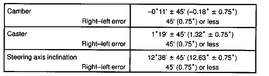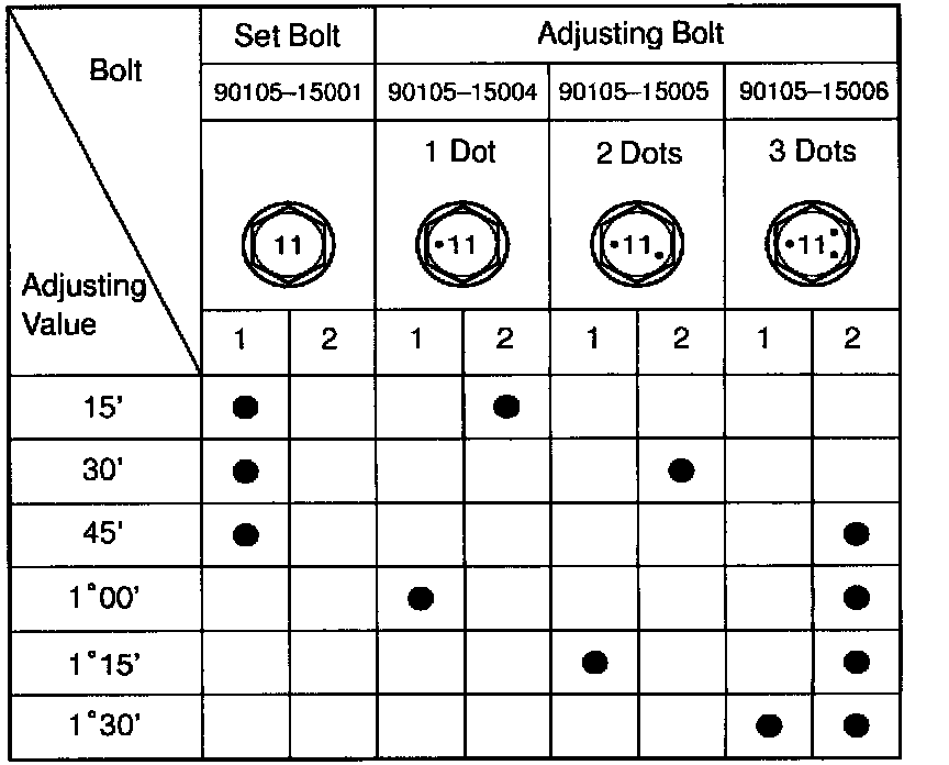 ^ Adjusting value for the set bolts is 6'- 30' (0.1 0.50). If the camber is not within the specified value, using the following table, estimate how much additional camber adjustment will be required, and select the camber adjusting bolt.