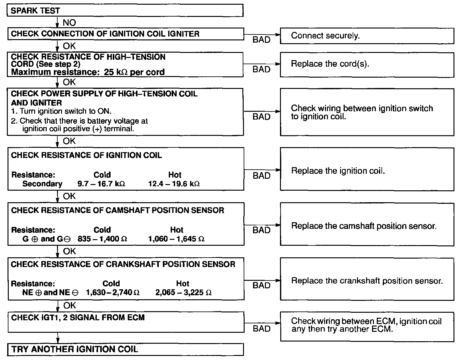 NOTE: To prevent gasoline from being injected from injectors during this test, crank the engine for no more than 5-10 seconds at time. If the spark done not occur, do the test as shown in the diagram.