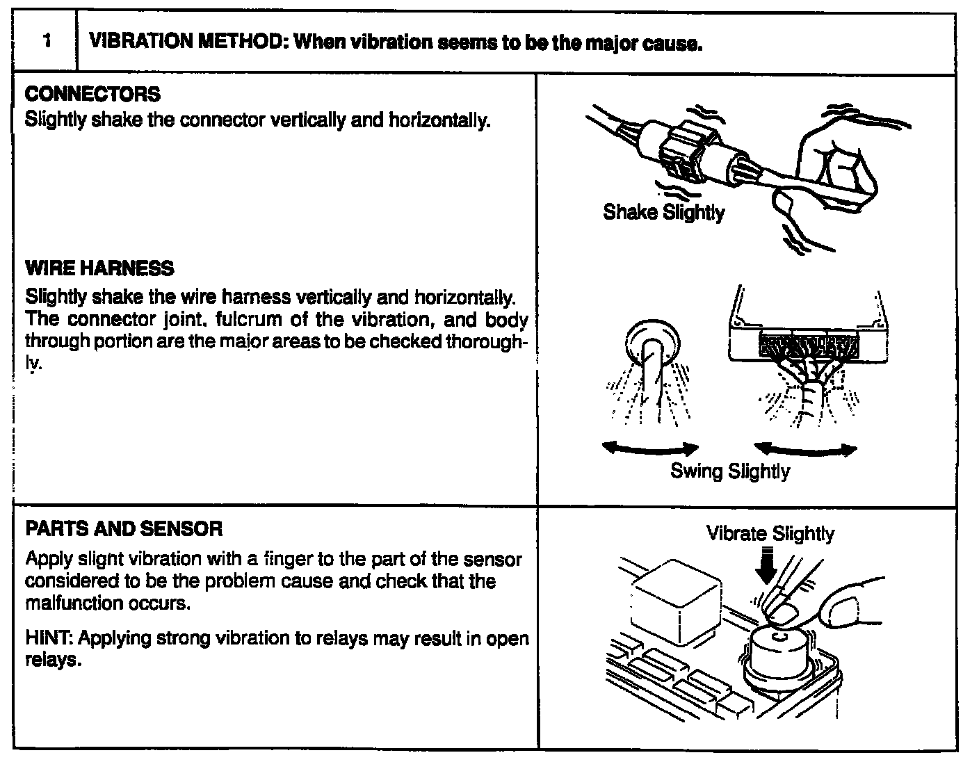 For example, for a problem which only occurs when the engine is cold, or for a problem which occurs due to vibration caused by the road during driving, etc., the problem can never be determined so long as the symptoms are confirmed with the engine hot condition or the vehicle at a standstill. Since vibration, heat or water penetration (moisture) is likely cause for problem which is difficult to reproduce, the symptom simulation tests introduced here are effective measures in that the external causes are applied to the vehicle in a stopped condition.