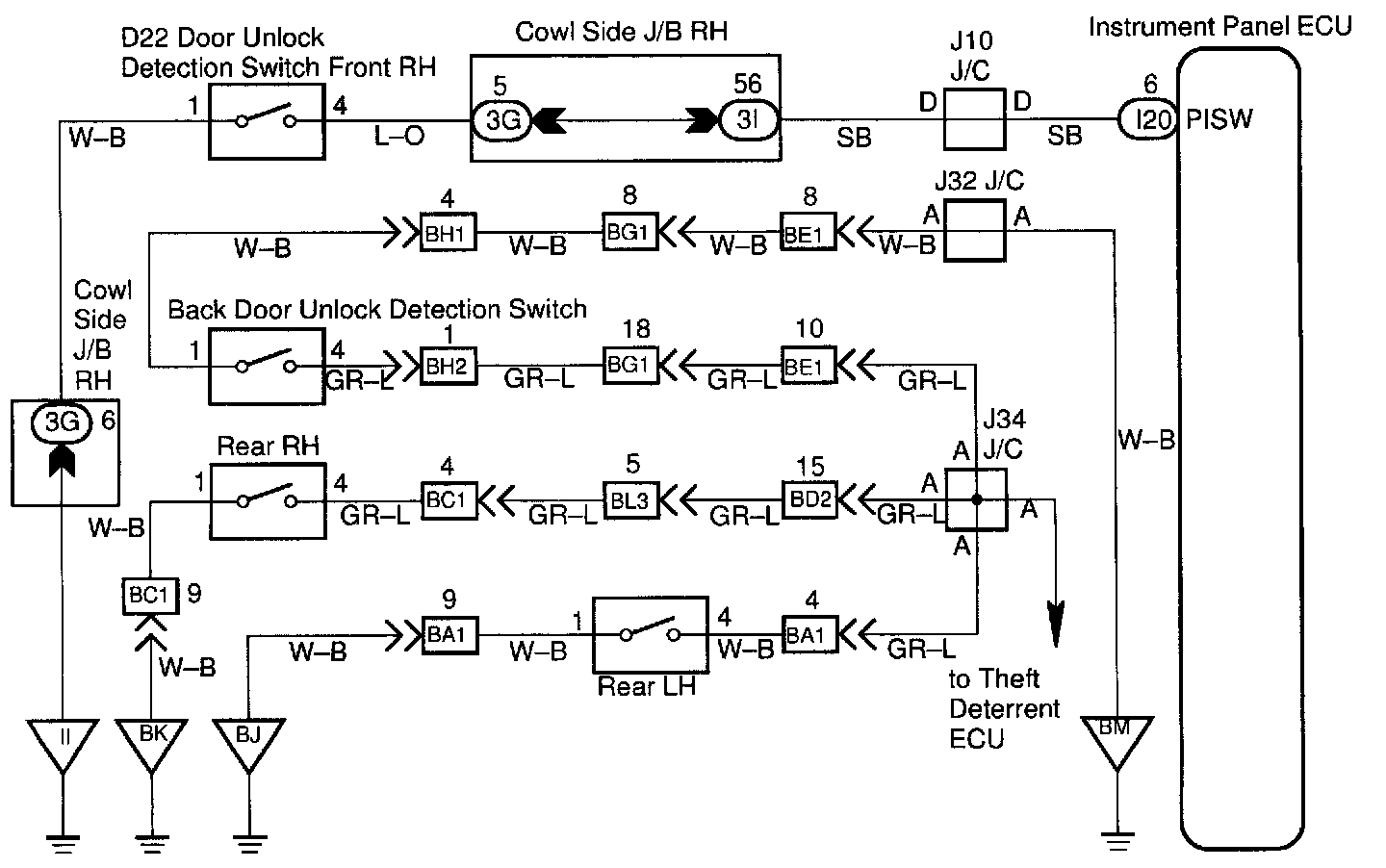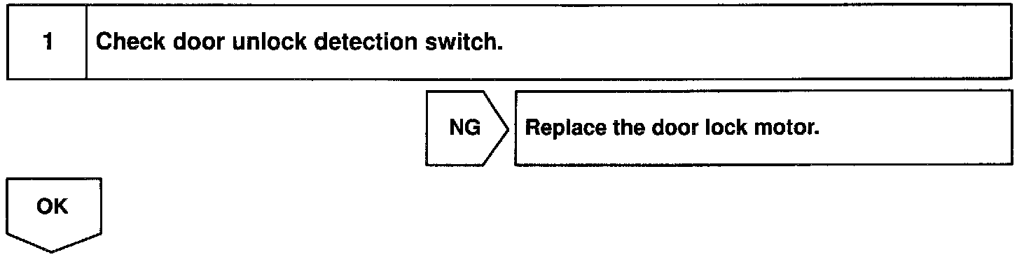 CIRCUIT DESCRIPTIONThe door unlock detection switch is built in the door lock motor assembly. This switch is ON when the door lock knob is in the unlock position and OFF when the lock knob is in the lock position. The ECU detects the door lock knob conditions by this circuit. It is used as one of the operating conditions for the key confinement prevention function.