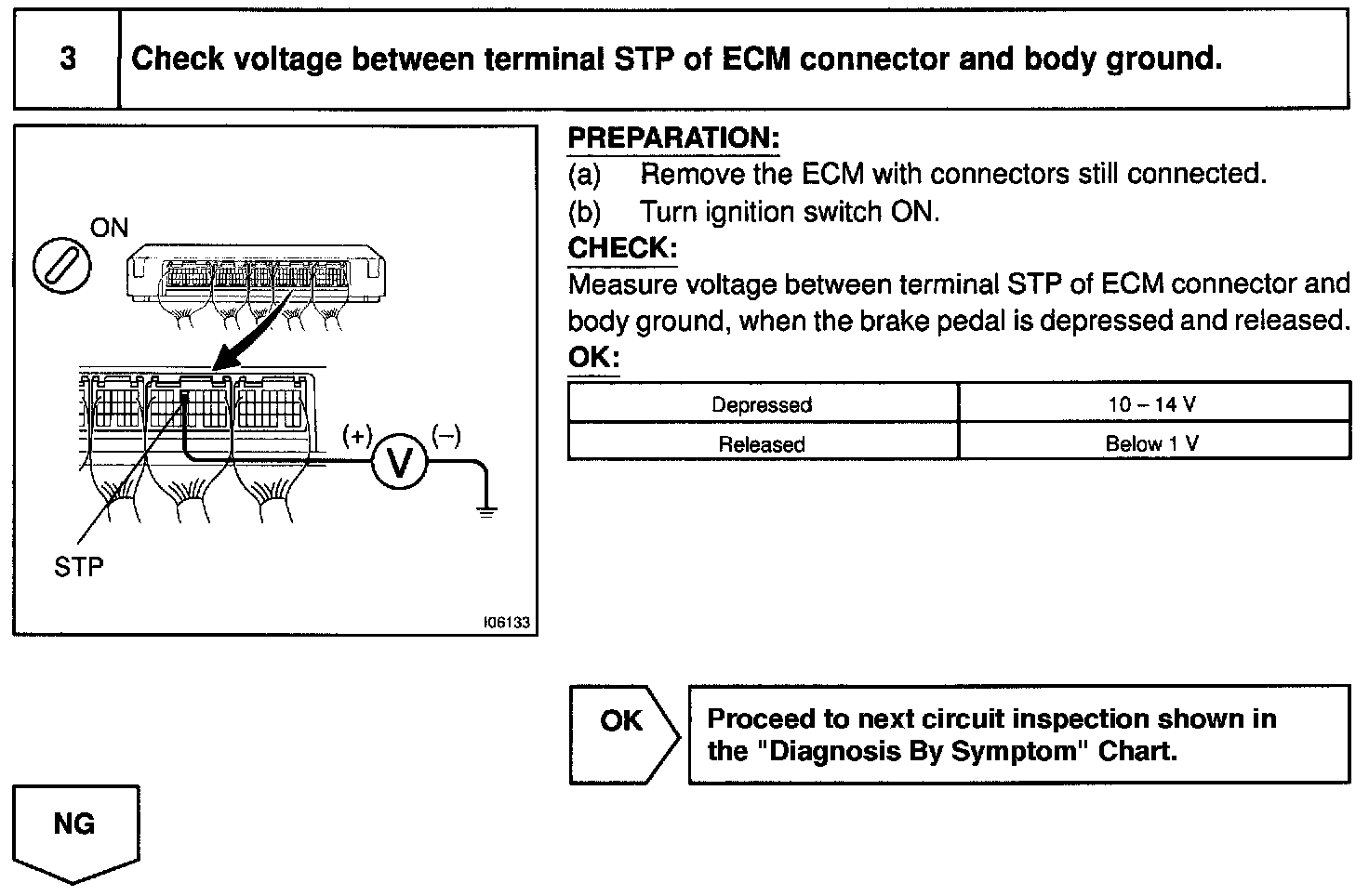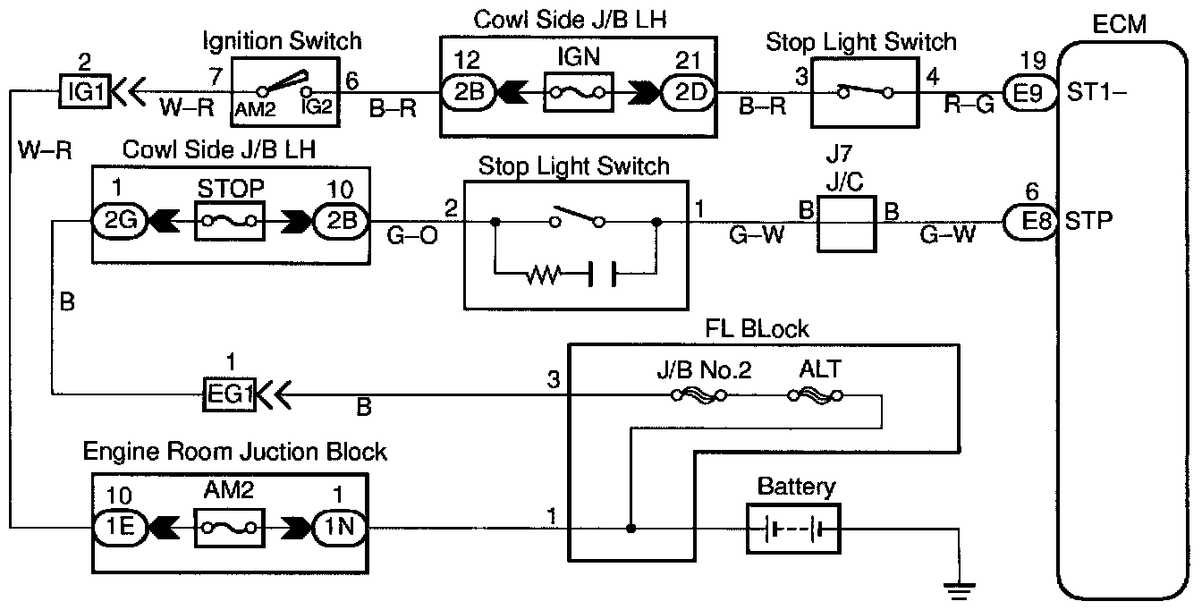 When the brake is on, battery positive voltage is normally applied through the STOP fuse and stop light switch to terminal STP of the ECM, and the ECM turns the cruise control OFF.