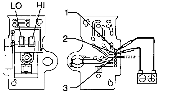 b. Connect the positive (+) lead from the battery to terminal 1 and negative (-) lead to each terminal, then check that the "LO" and "HI" indicators light up as shown in the chart.