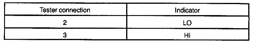1. Connect the positive (+) lead from the battery to terminal 1 and negative (-) lead to each terminal, then check that the "LO" and "HI" indicators light up as shown in the chart.