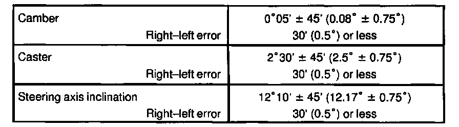 If the steering axis inclination is not within the specified value, after the camber and caster have been correctly adjusted, recheck the steering knuckle and front wheel bearing for looseness.