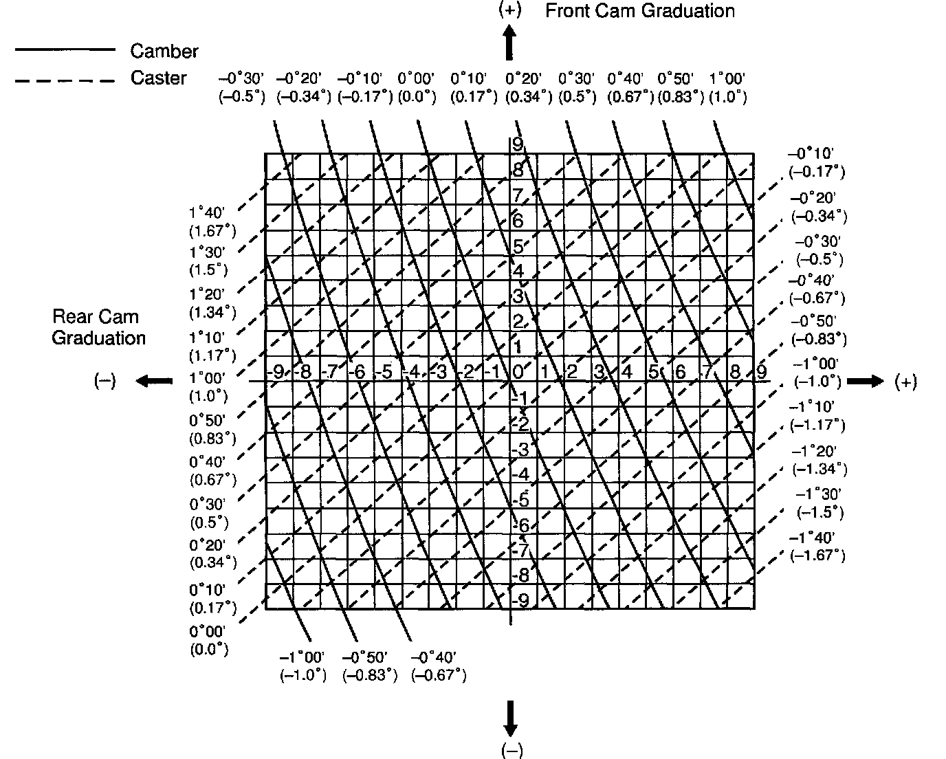 3. As shown in the chart, read the distances from the marked point to 0 point, and adjust the front and/or rear adjusting cams accordingly.