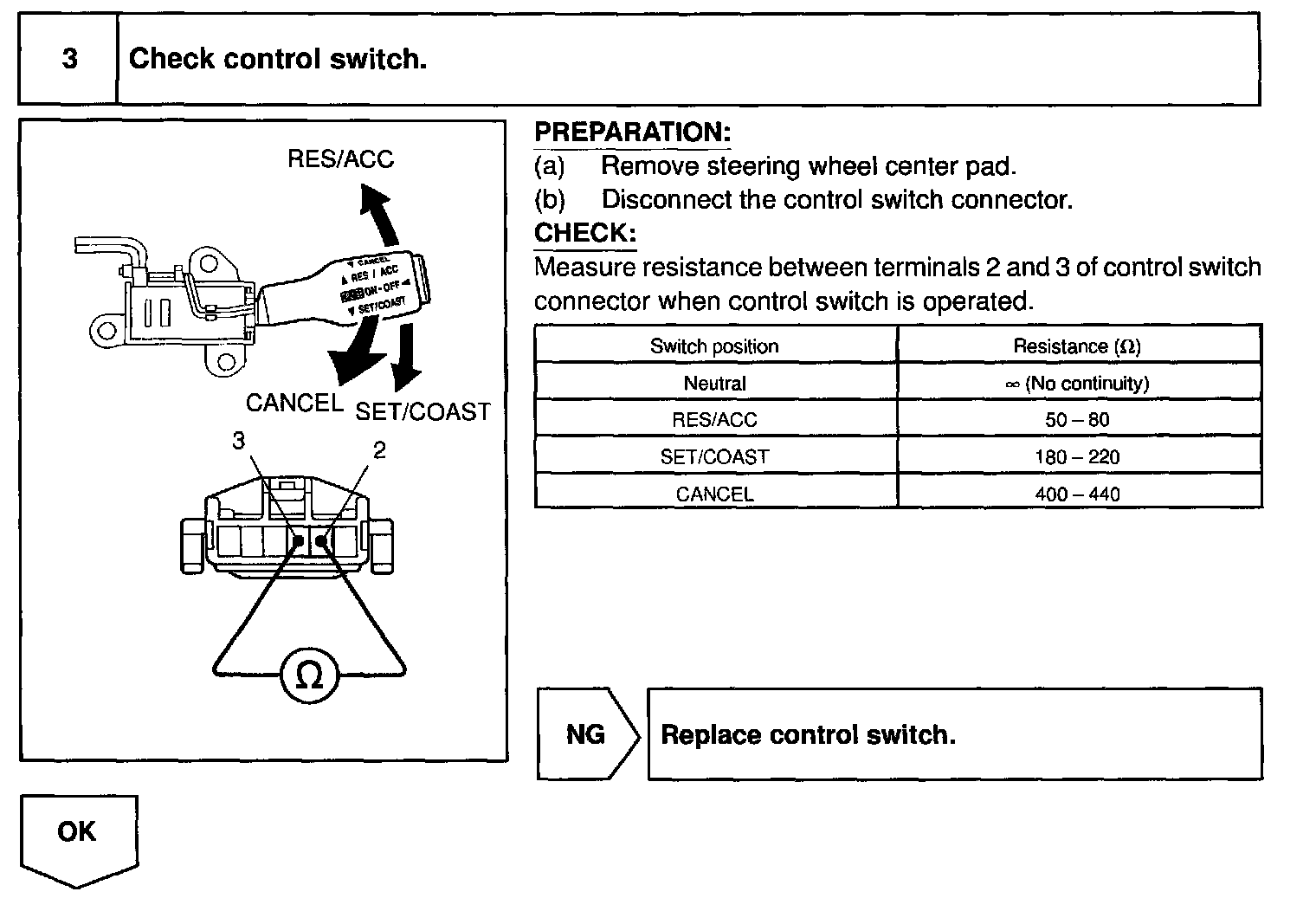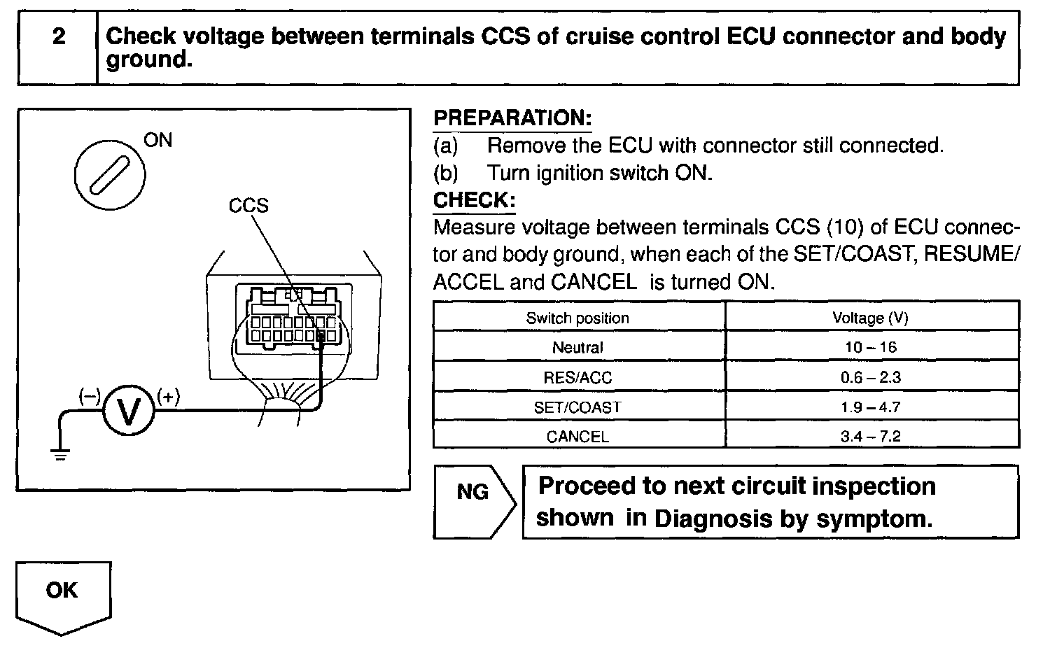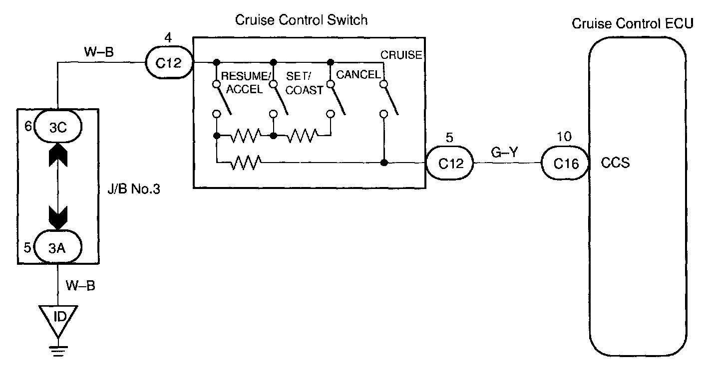 This circuit carries the SET/COAST, RESUME/ACCEL and CANCEL signals (each voltage) to the ECU.