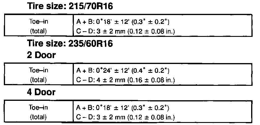 ^ The toe-in will change about 2.5 mm (0.10 inch) with each graduation of the cam (both side).