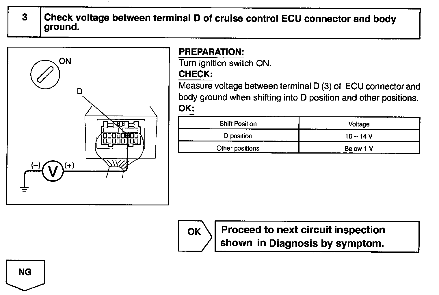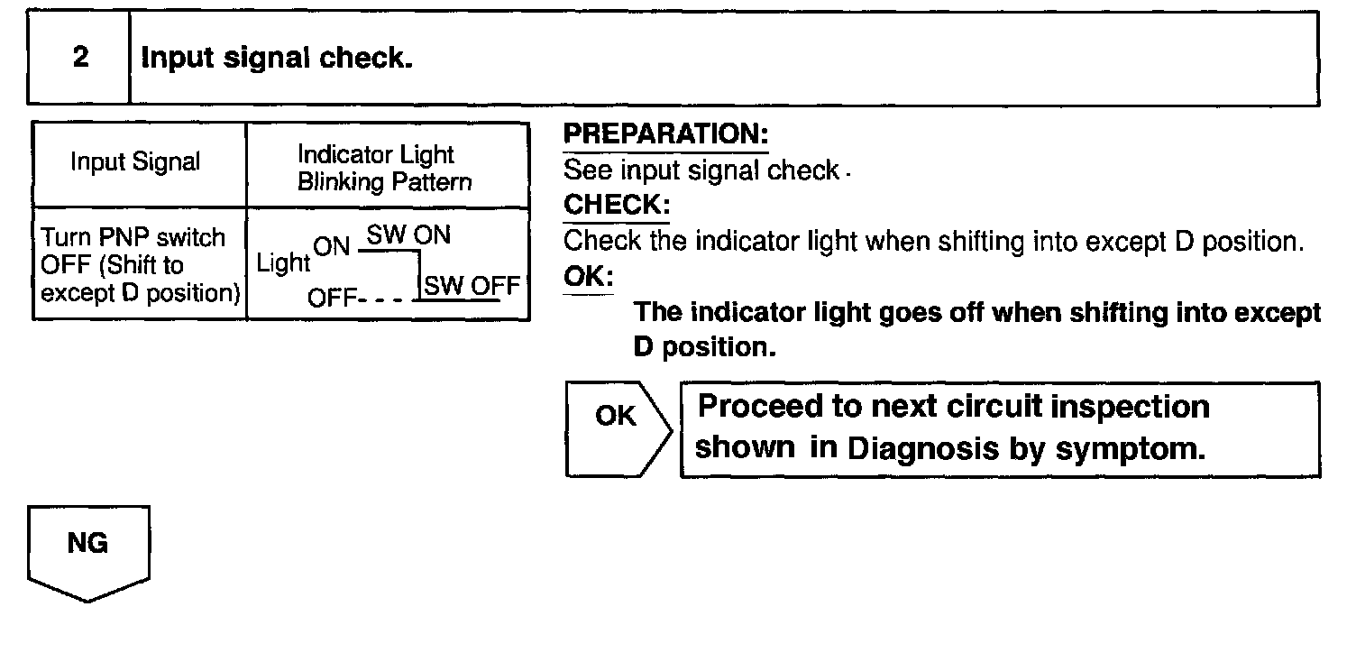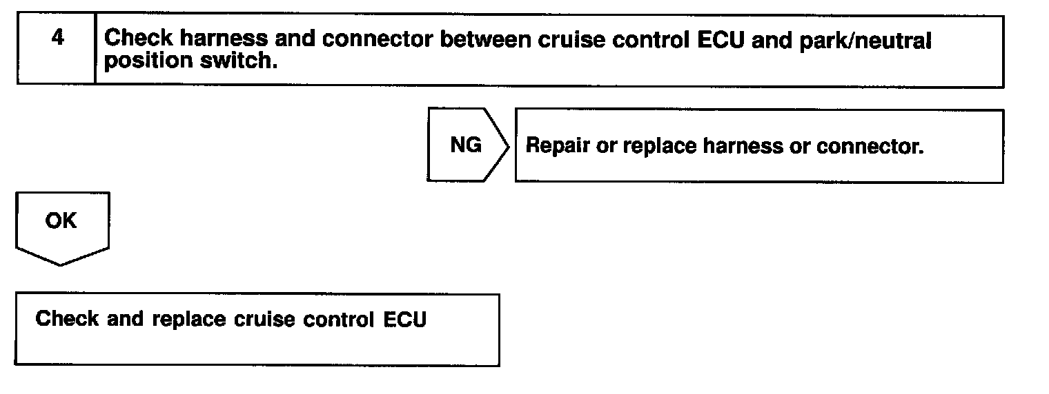 CIRCUIT DESCRIPTIONWhen the shift position is in except D position, a signal is sent from the park/neutral position switch to the ECU. When this signal is input during cruise control driving, the ECU cancels the cruise control.