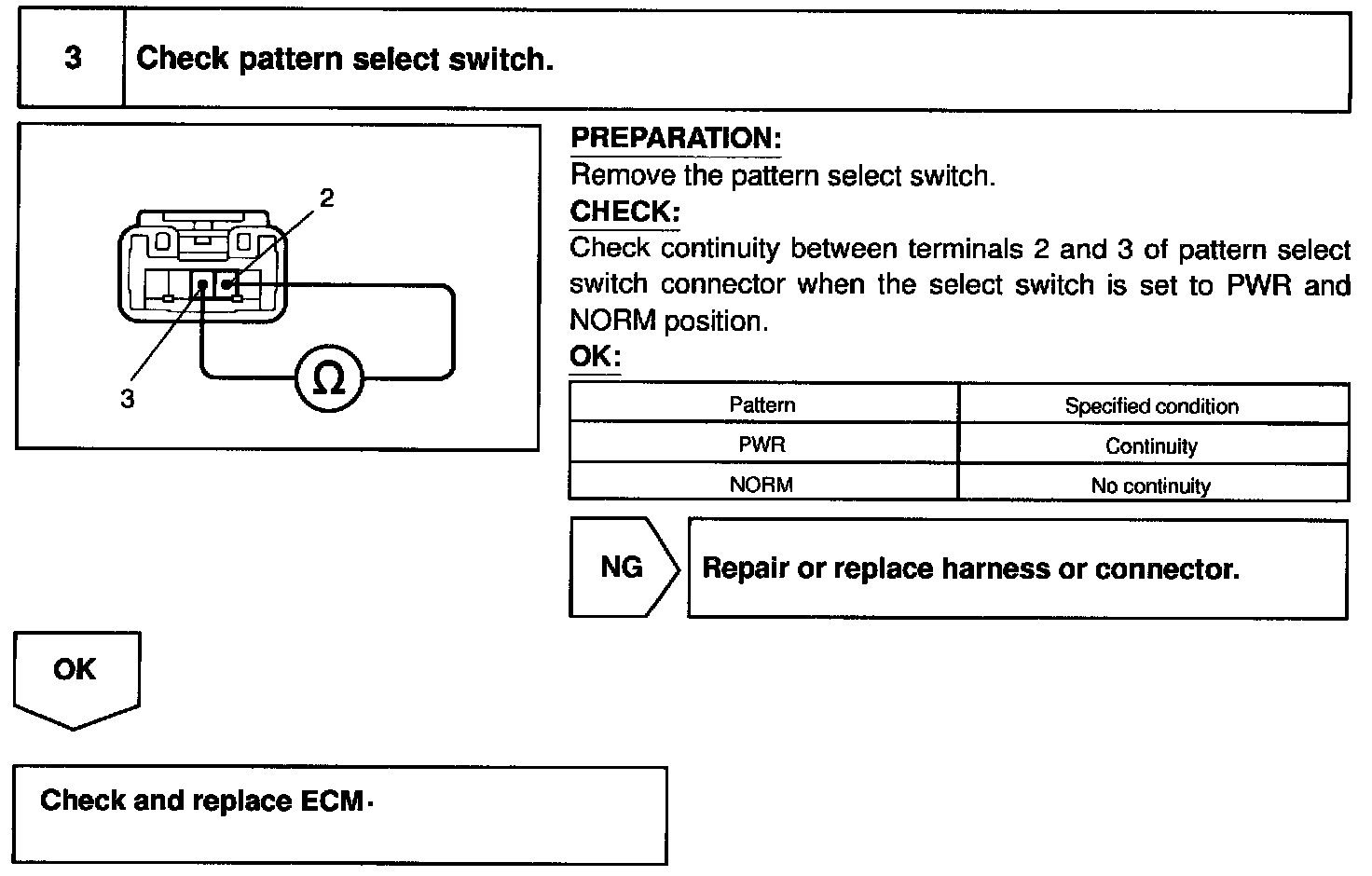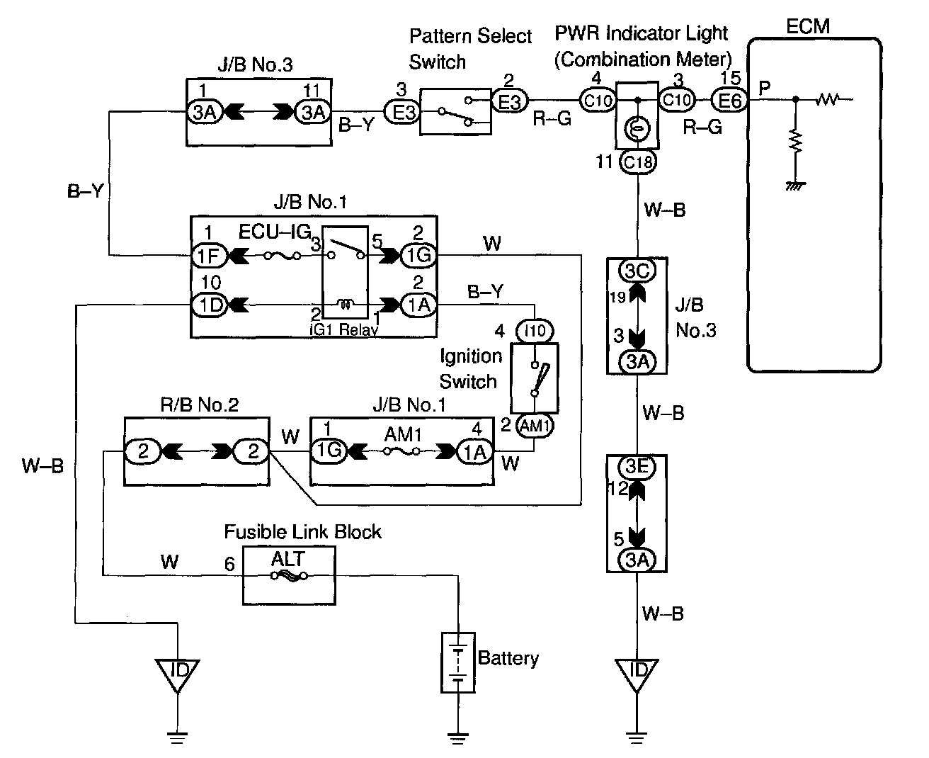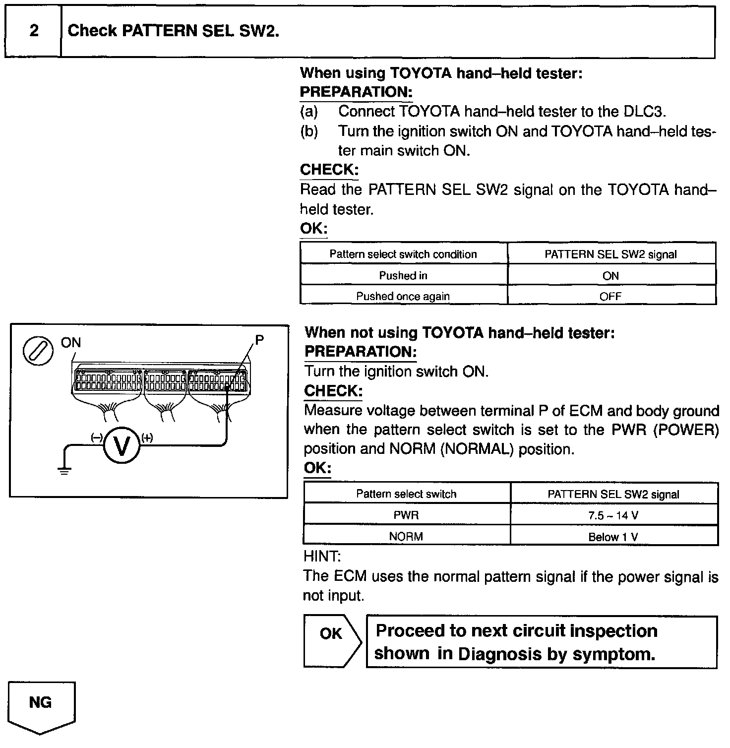 CIRCUIT DESCRIPTIONThe ECM memory contains the shift programs for the NORMAL and POWER patterns, 2 position, L position and the lock-up patterns. Following the programs corresponding to the signals from the pattern select switch, the park/neutral position and other various sensors, the ECM switches the solenoid valves ON and OFF, and controls the transmission gear change and the lock-up clutch operation.