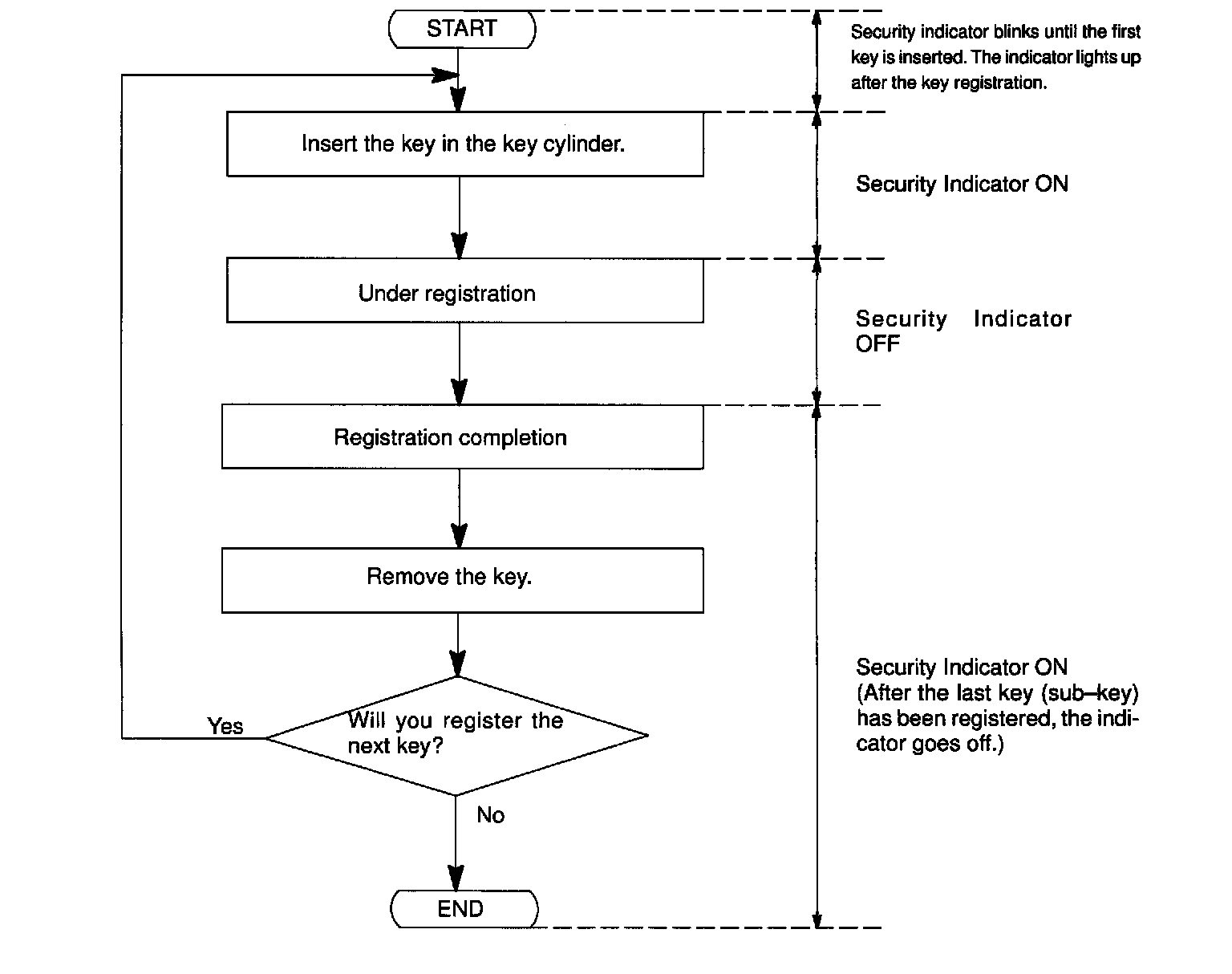 - When a key is not inserted in the key cylinder on the automatic registration mode, the security indicator always lights on.