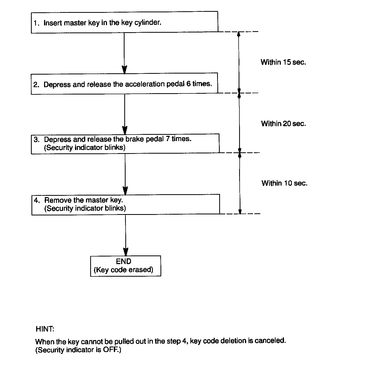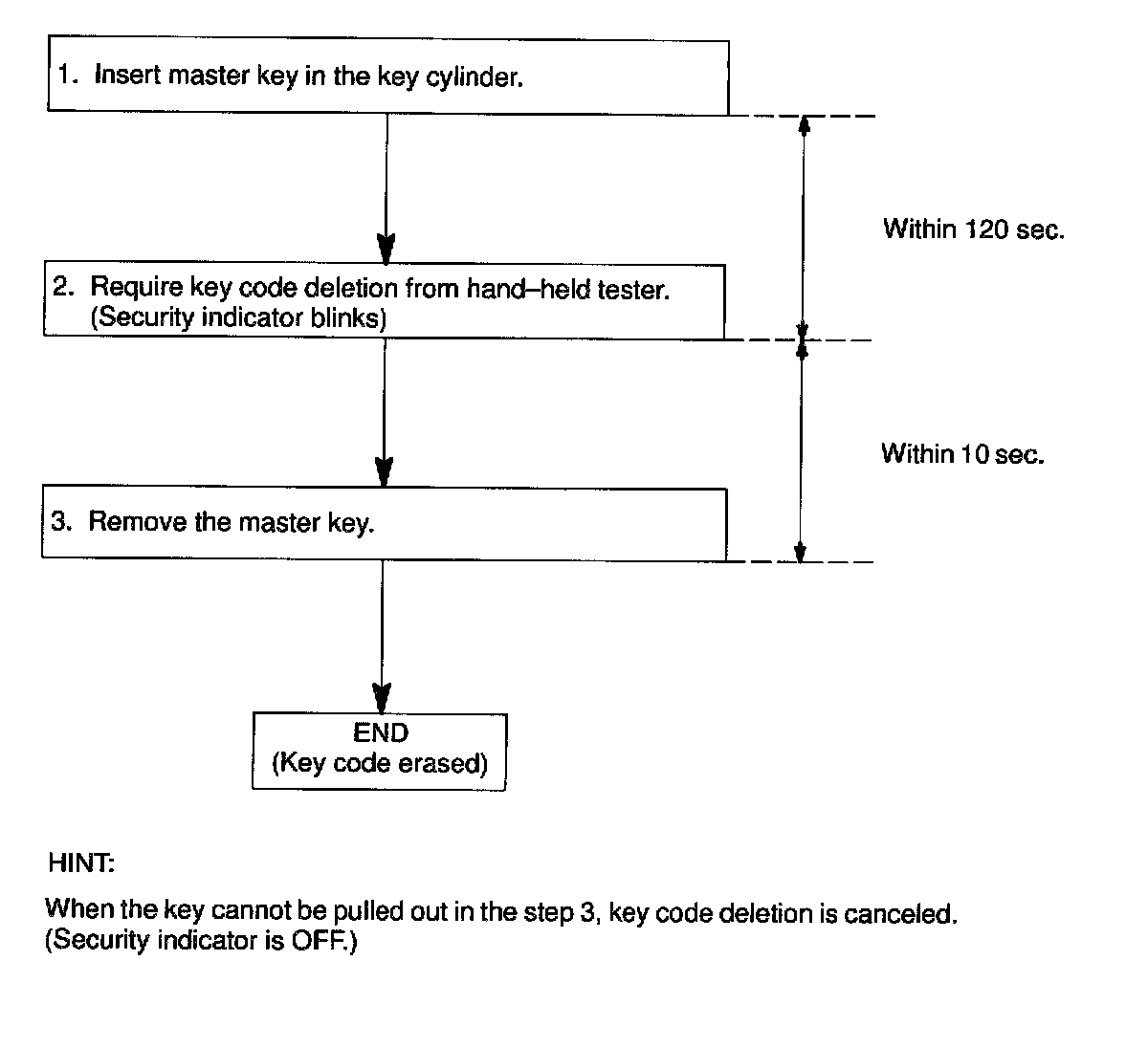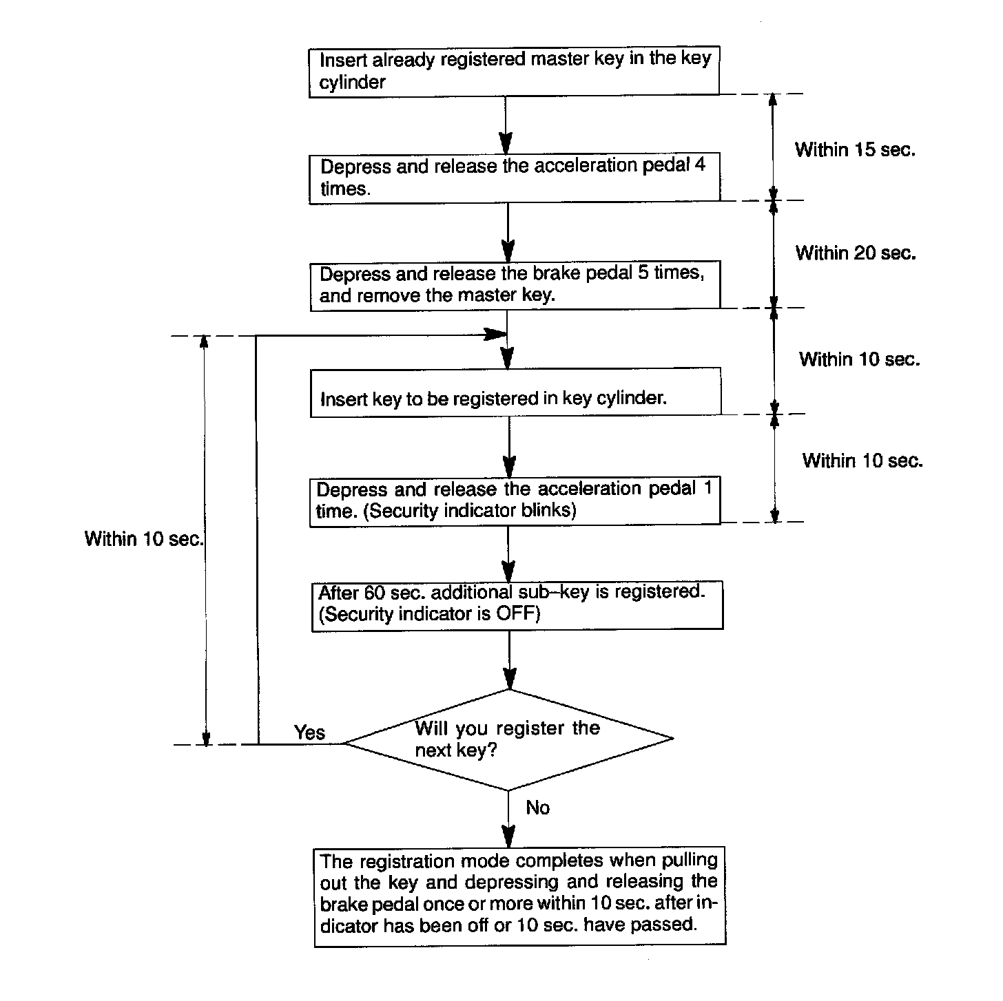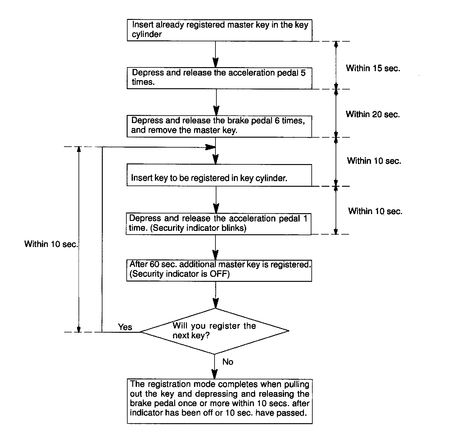 HINT: In case of having lost all the already registered master keys, you are not able to do additional registration or deletion. Change the ECM and then must register the new key codes according to the following registration procedure of the automatic registration mode.1. KEY REGISTRATION IN AUTOMATIC REGISTRATION MODE