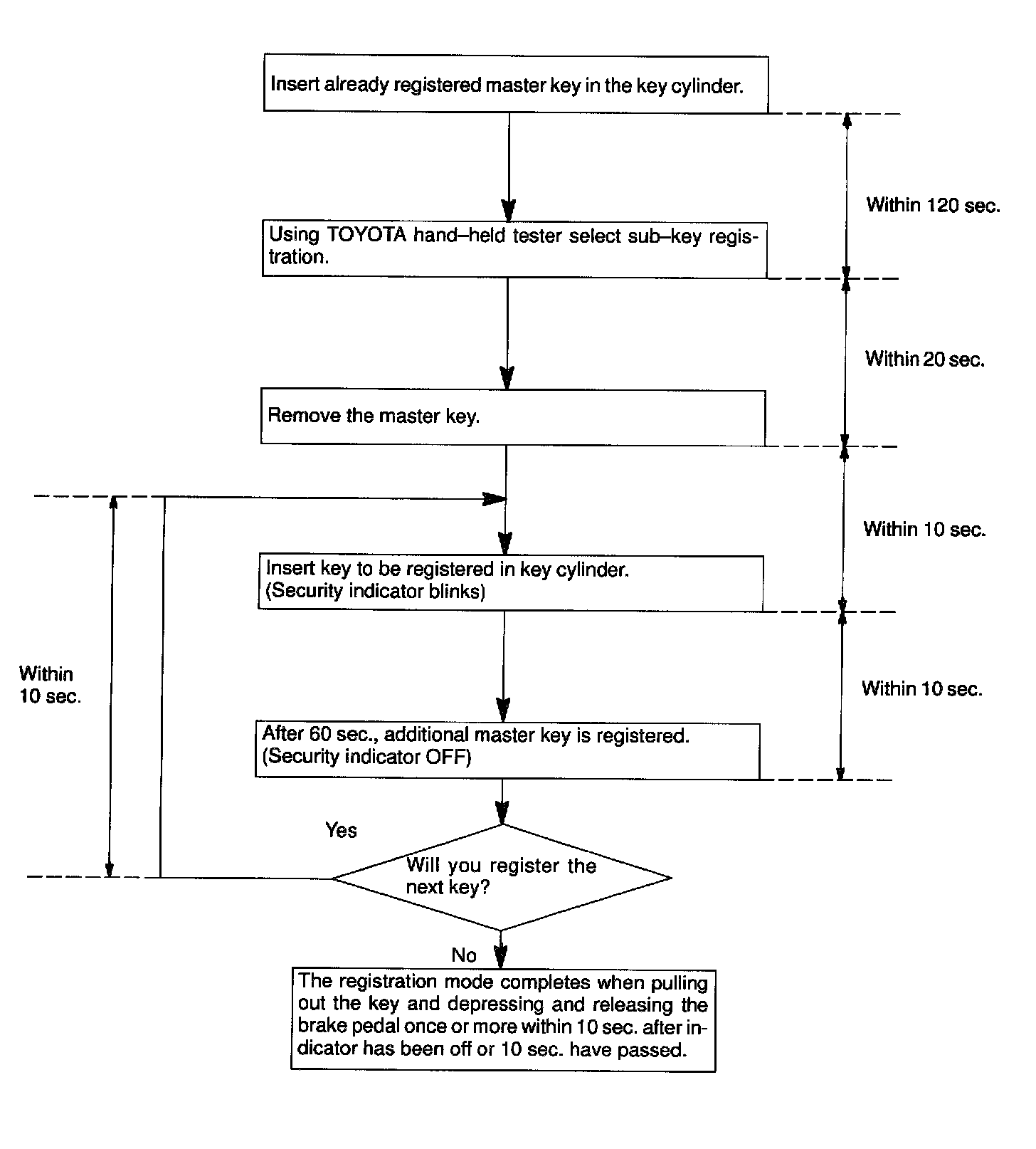 There are 2 ways for registration of additional master key, one way is depressing brake pedal and acceleration pedal and the other way is using TOYOTA hand-held tester.