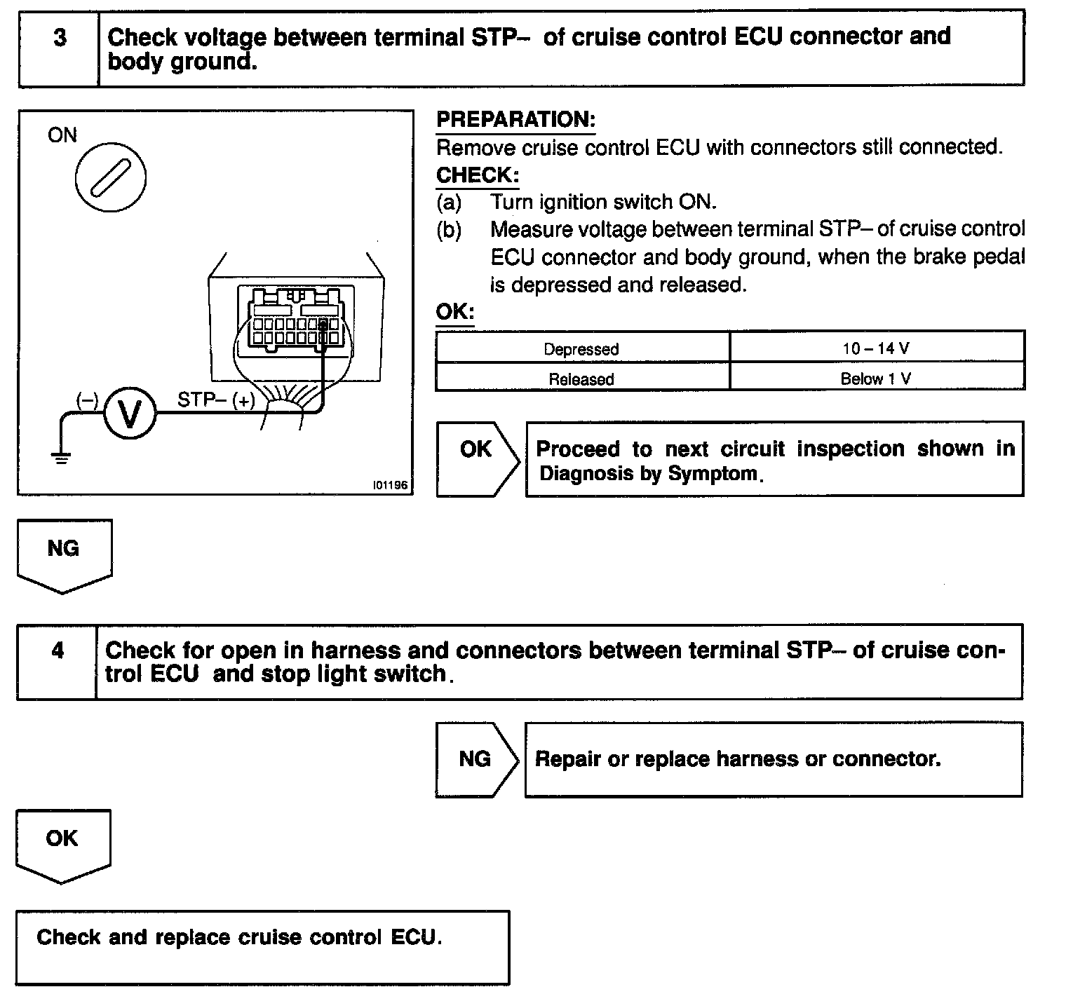 If the harness connected to terminal STP- has an open circuit, terminal STP- will have battery positive voltage and the cruise control will be turned OFF.