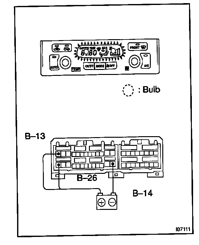 Connect the positive (+) lead from the battery to terminal B-13, B-26 and the negative (-) lead to terminal B-14, then check that the illumination lights up.