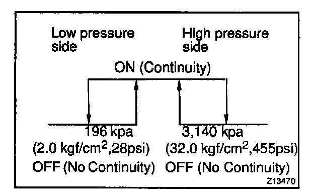 b. Check continuity between terminals when refrigerant pressure is changed, as shown in the illustration.