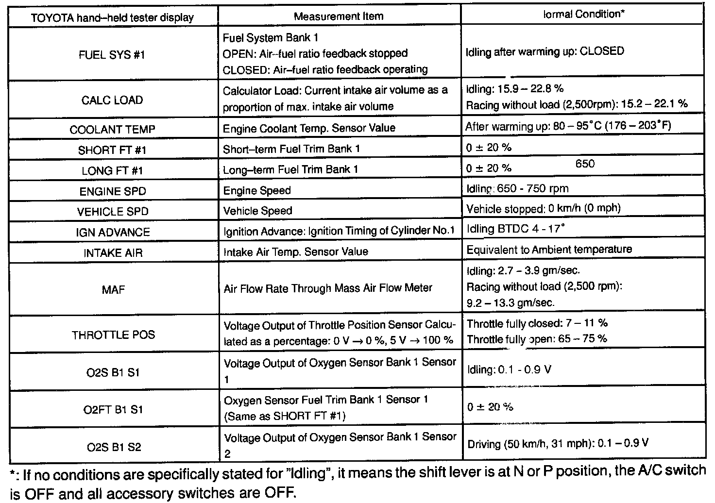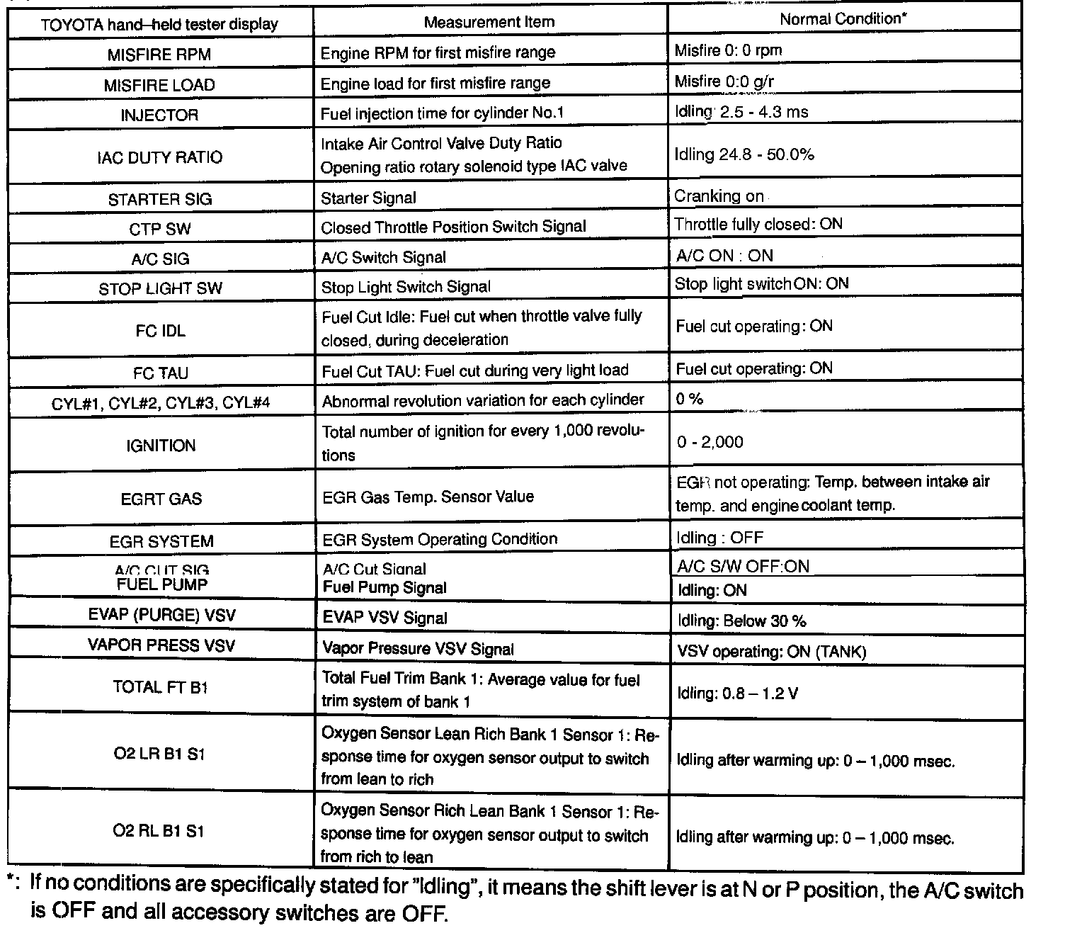 ENGINE OPERATING CONDITIONNOTE: The values given below for "Normal Condition" are representative values, so a vehicle may still be normal even if its value varies differ from those listed here. So do not decide whether a part is faulty or not solely according to the "Normal Condition" here.