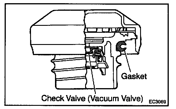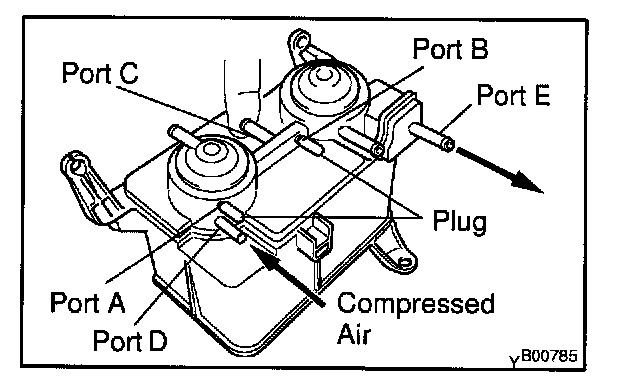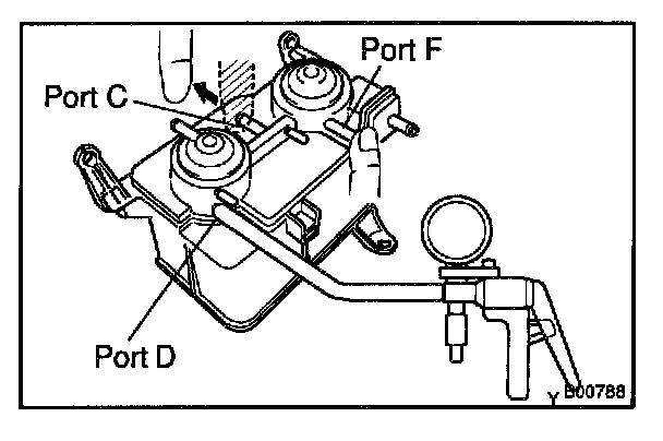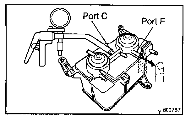 5. While holding port F closed, apply vacuum (2.94 kPa, 22 mm Hg, 0.87 in.Hg) to port D, check that the vacuum does not decrease when port C is closed, and check that the vacuum decreases when port C is released.