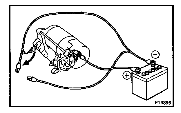 b. Connect the battery to the magnetic switch as shown. Check that the clutch pinion gear moves outward.