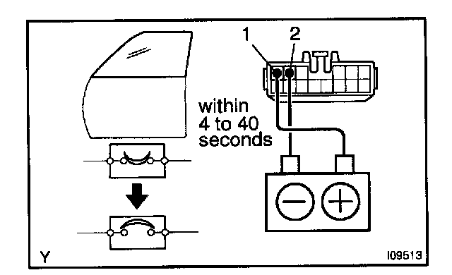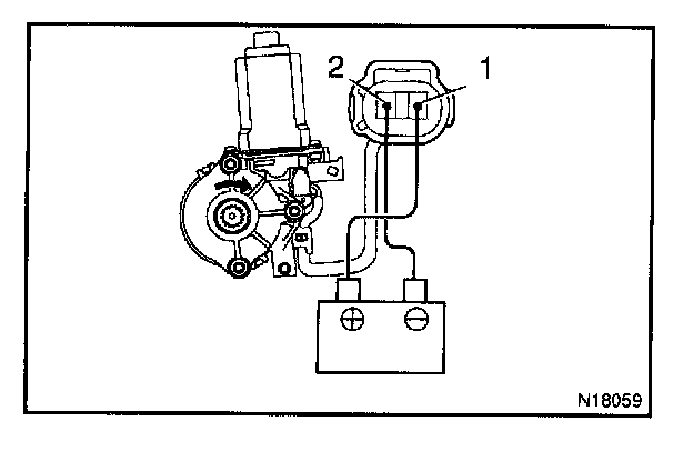 b. Connect the positive (+) lead from the battery to terminal 1 and the negative (-) lead to terminal 2 on the wire harness side connector and raise the window to full closed position.