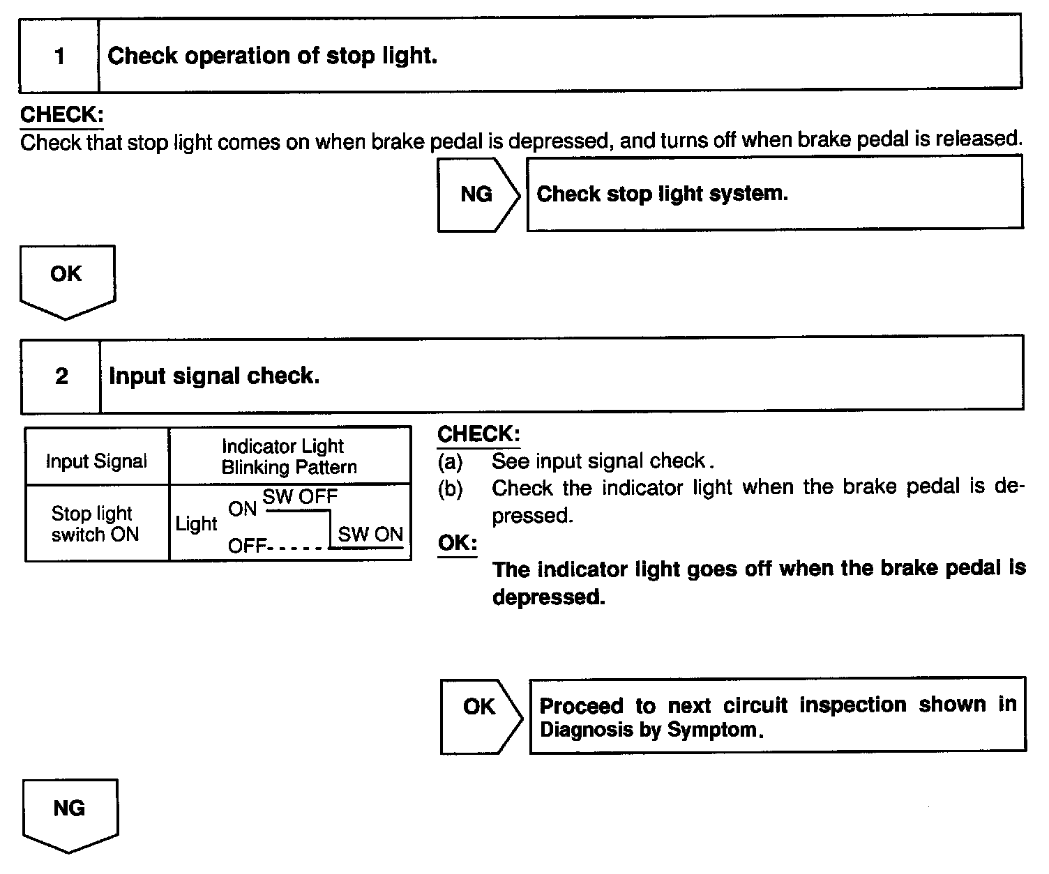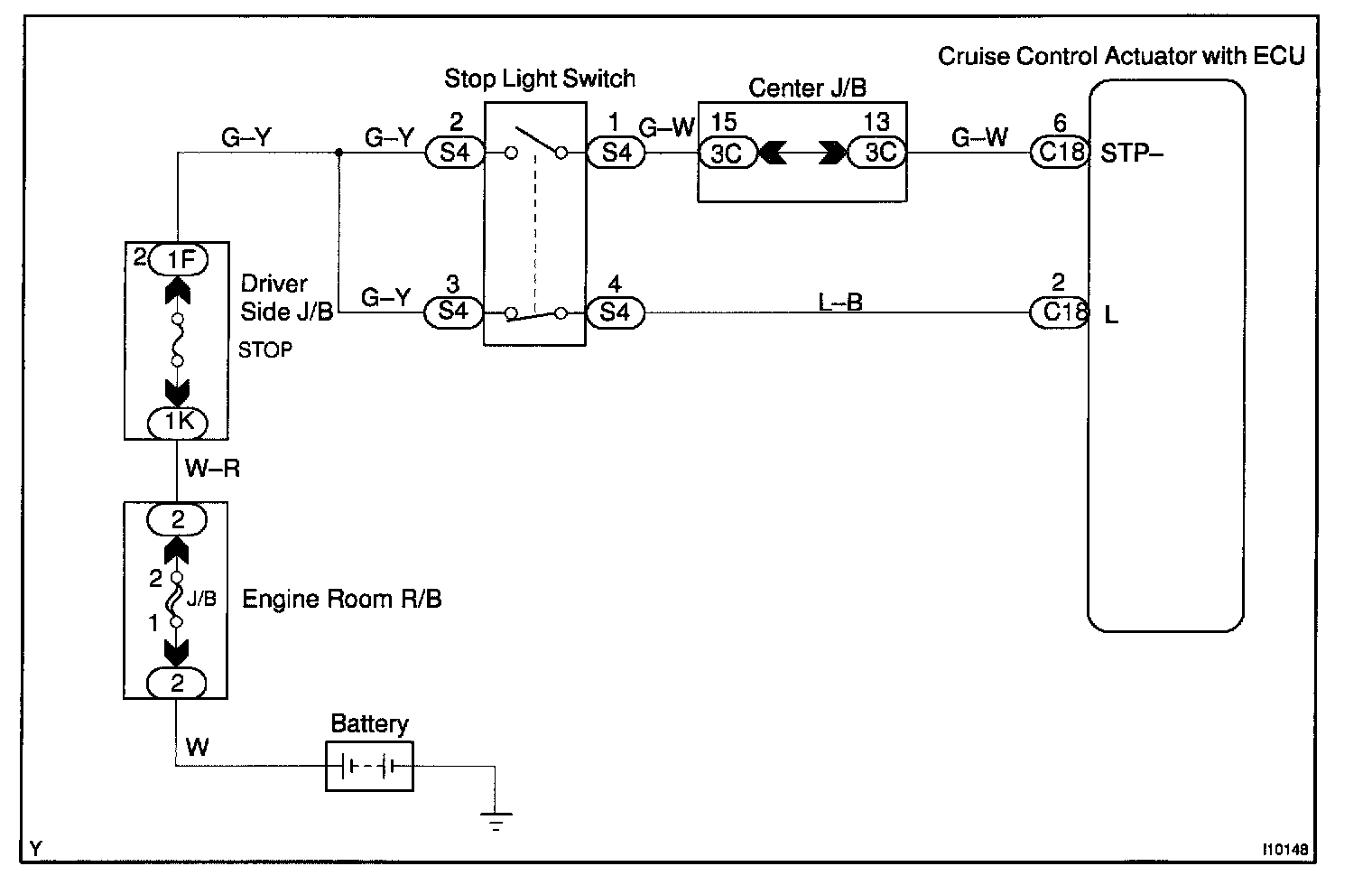 CIRCUIT DESCRIPTIONWhen the brake is ON, battery positive voltage normally is applied through the STOP fuse and stop light switch to terminal STP- of the ECU, and the ECU turns the cruise control OFF.