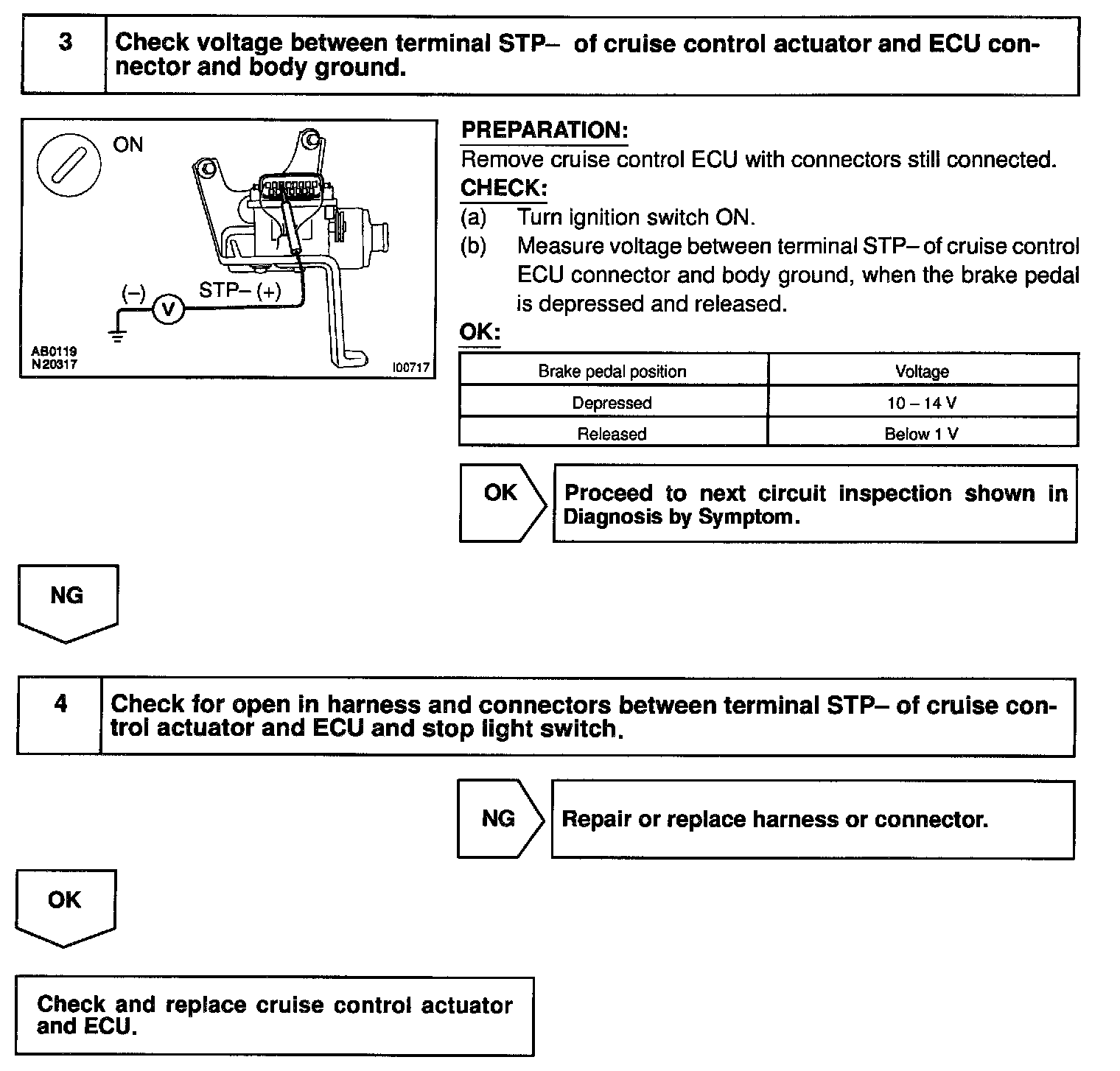 If the harness connected to terminal STP- has an open circuit, terminal STP- will have battery positive voltage and the cruise control will be turned OFF.