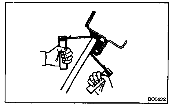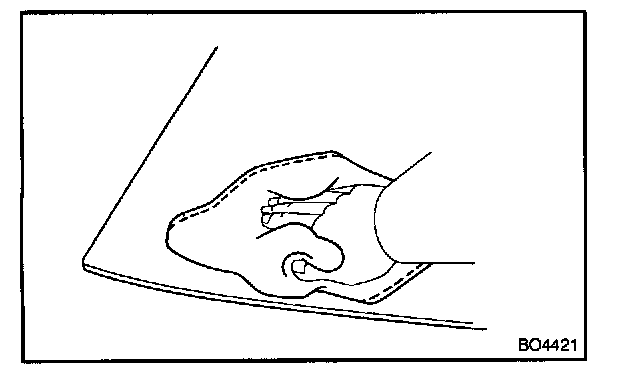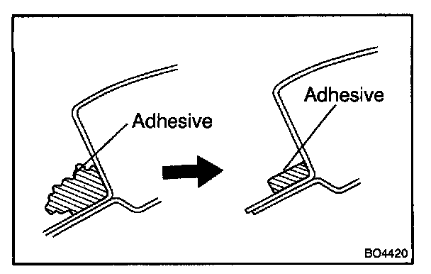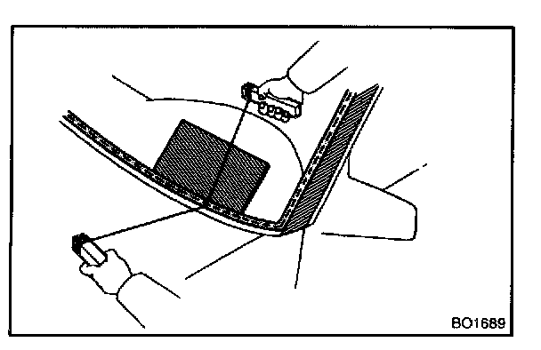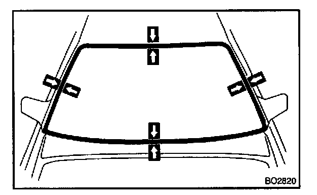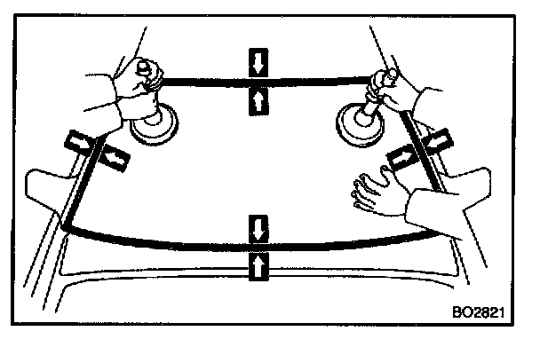 NOTE: When separating the glass, take care not to damage the paint and interior and exterior ornaments. To prevent scratching the safety pad when removing the windshield, place a plastic sheet between the piano wire and safety pad.