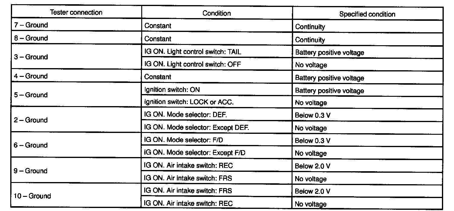 If circuit is as specified, try replacing the air intake switch with a new one. If the circuit is not as specified, inspect the circuits connected to other parts.