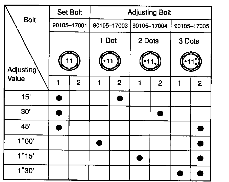 If the camber is not within the specification, using the table, estimate for how much additional camber adjustment will be required, and select the camber adjusting bolt.
