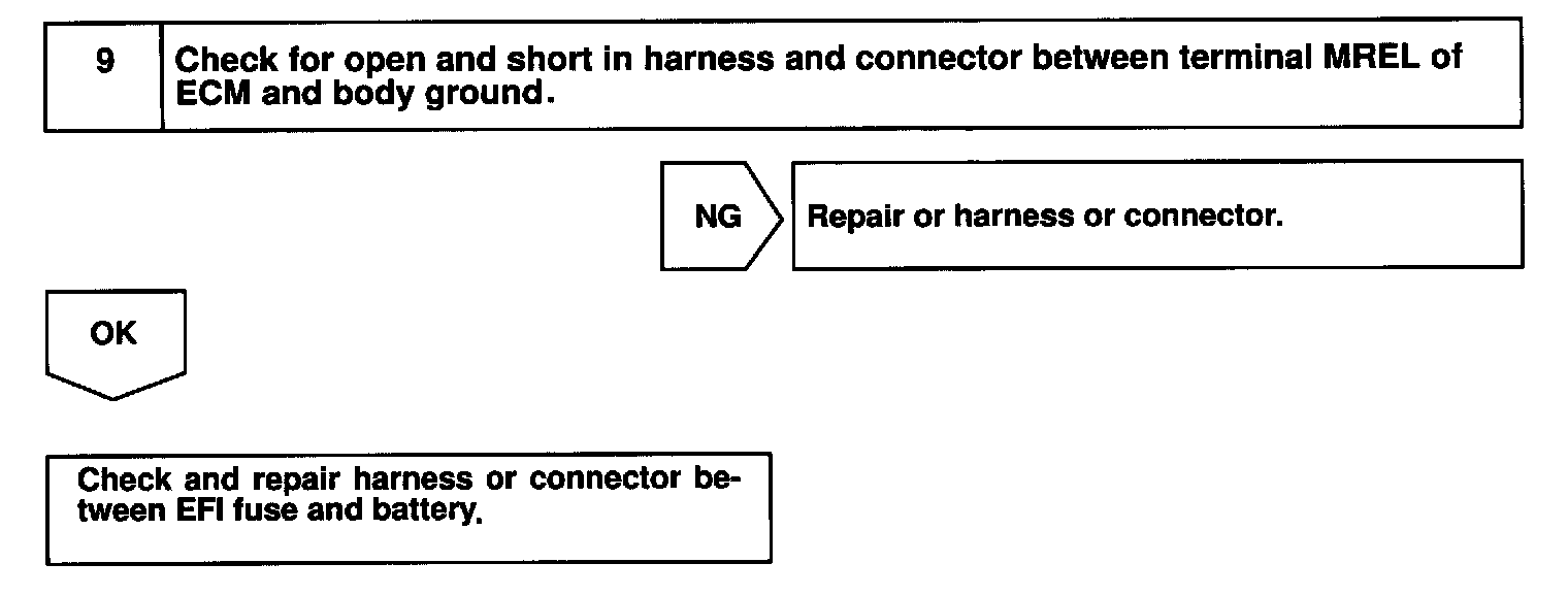 CIRCUIT INSPECTIONWhen the ignition switch is turned on, battery positive voltage is applied to terminal IGSW of the ECM and the EFI main relay (Marking: EFI) control circuit in the ECM sends a signal to terminal MREL of the ECM switching on the EFI main relay.