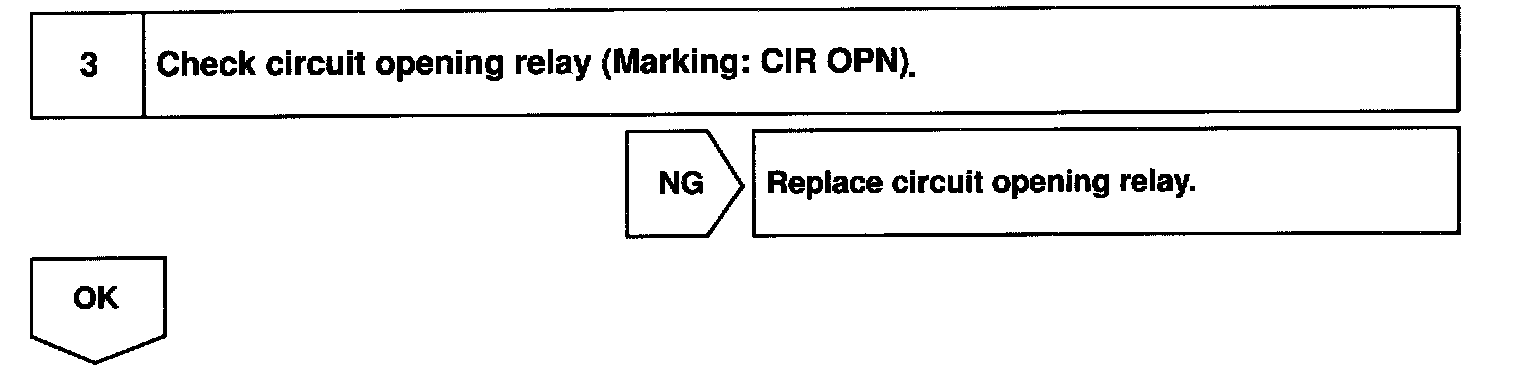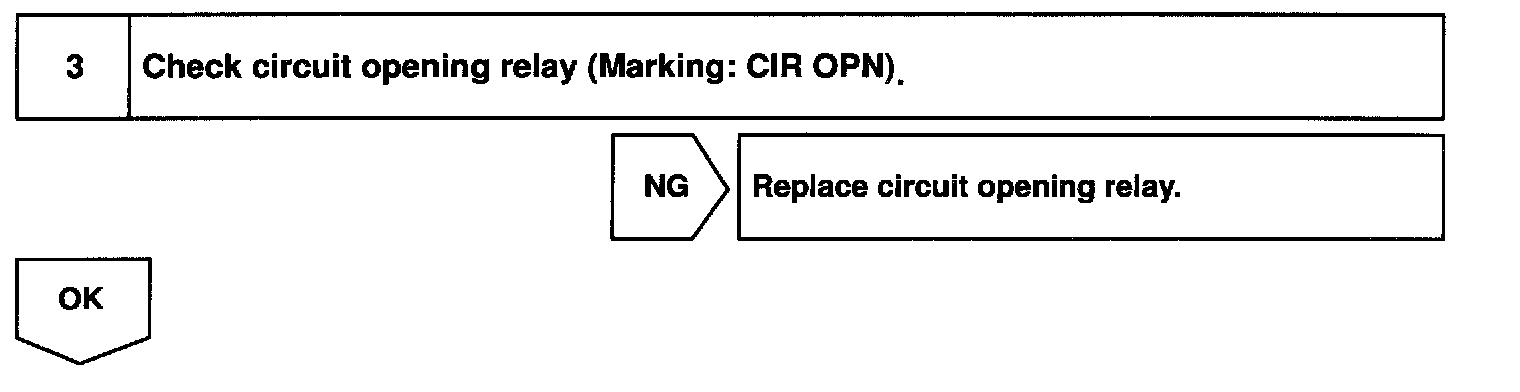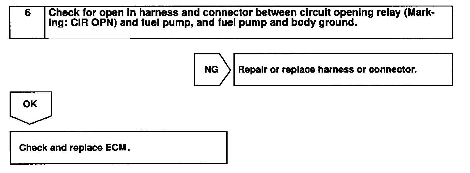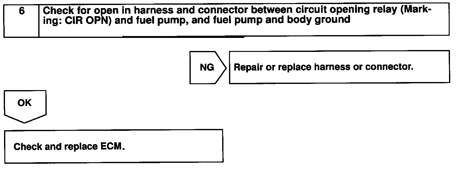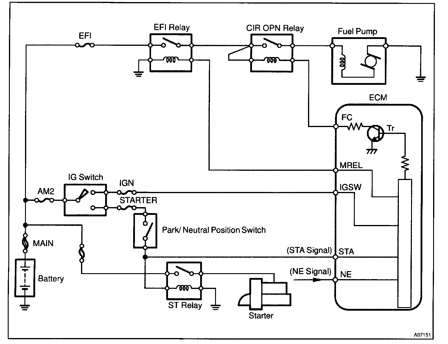 In the diagram below, when the engine is cranked, current flows from terminal ST of the ignition switch to the starter relay (Marking: ST) coil and also current flows to terminal STA of ECM (STA signal). When the STA signal and NE signal are input to the ECM, Tr is turned ON, current flows to coil of the circuit opening relay (Marking: CIR OPN), the relay switches on, power is supplied to the fuel pump and the fuel pump operates.