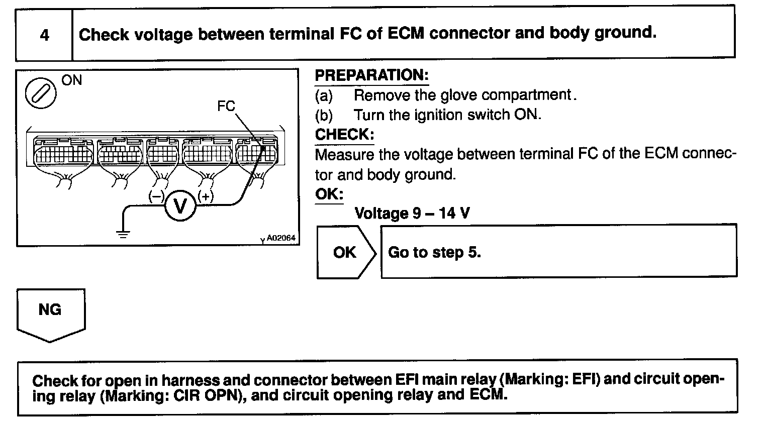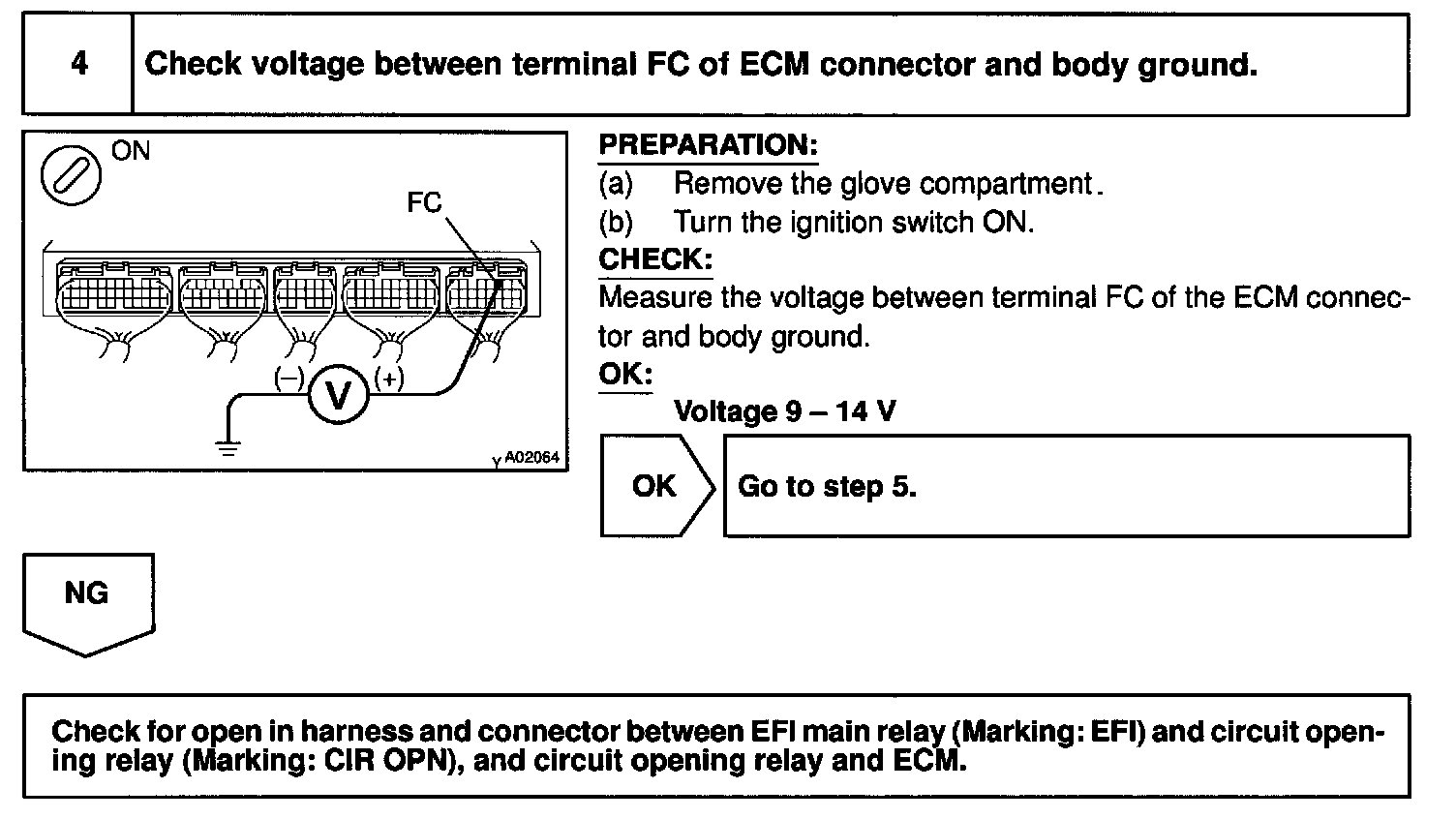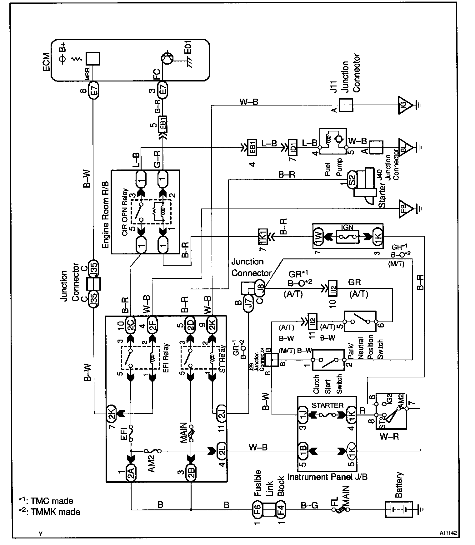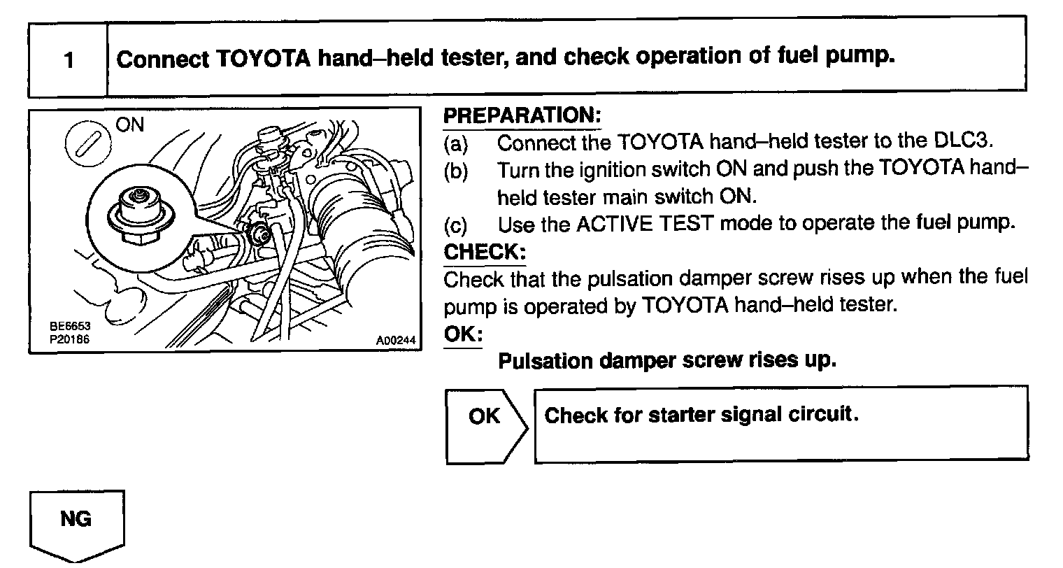 In the diagram below, when the engine is cranked, current flows from terminal ST of the ignition switch to the starter relay (Marking: ST) coil and also current flows to terminal STA of ECM (STA signal). When the STA signal and NE signal are input to the ECM, Tr is turned ON, current flows to coil of the circuit opening relay (Marking: CIR OPN), the relay switches on, power is supplied to the fuel pump and the fuel pump operates.